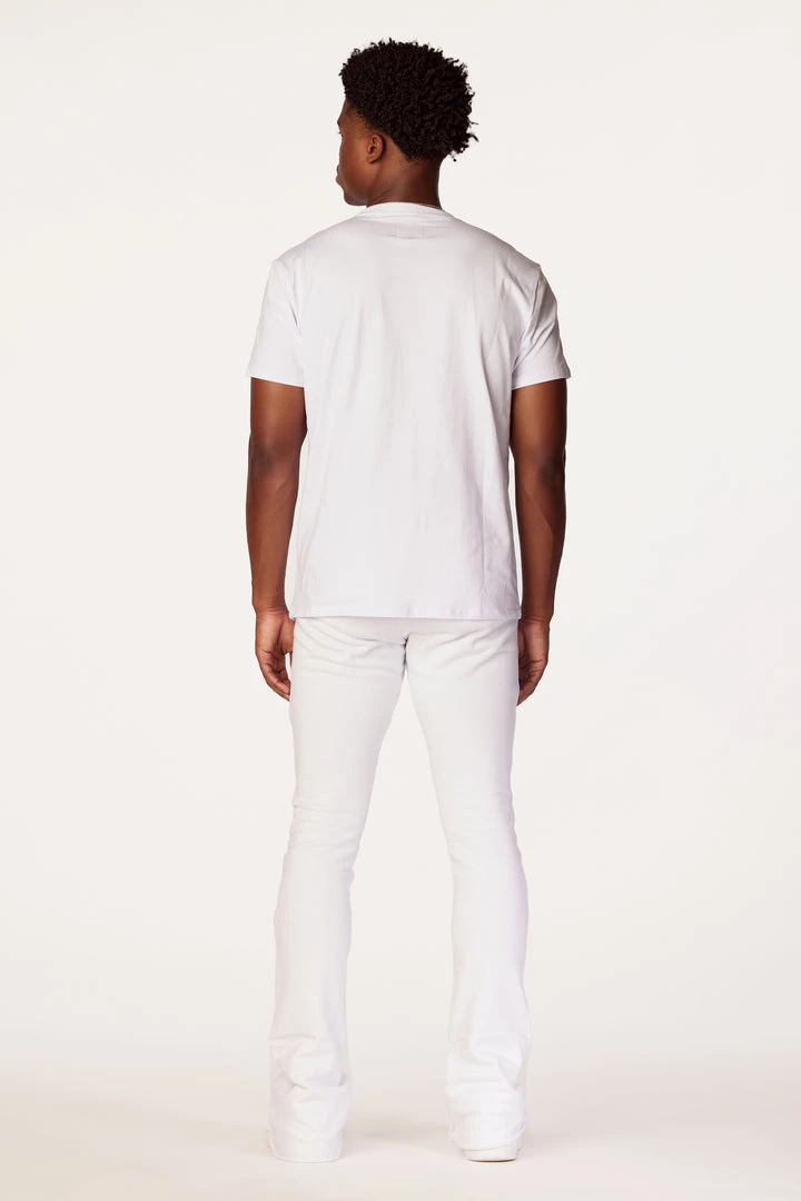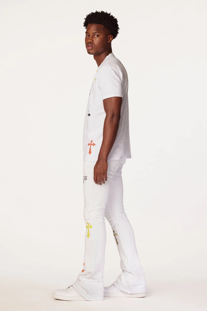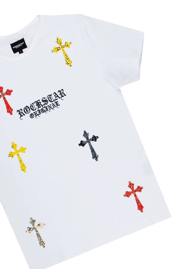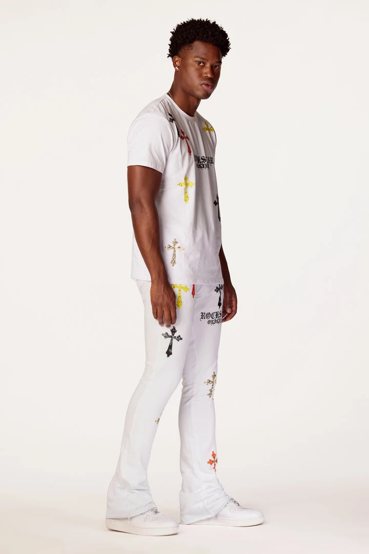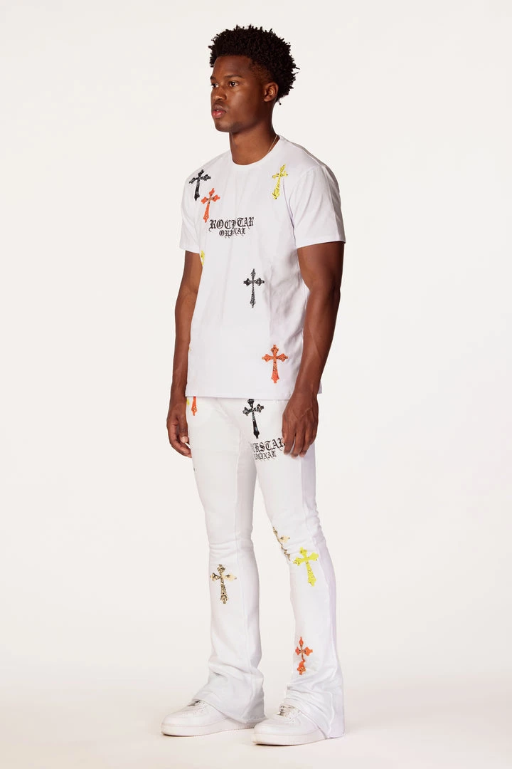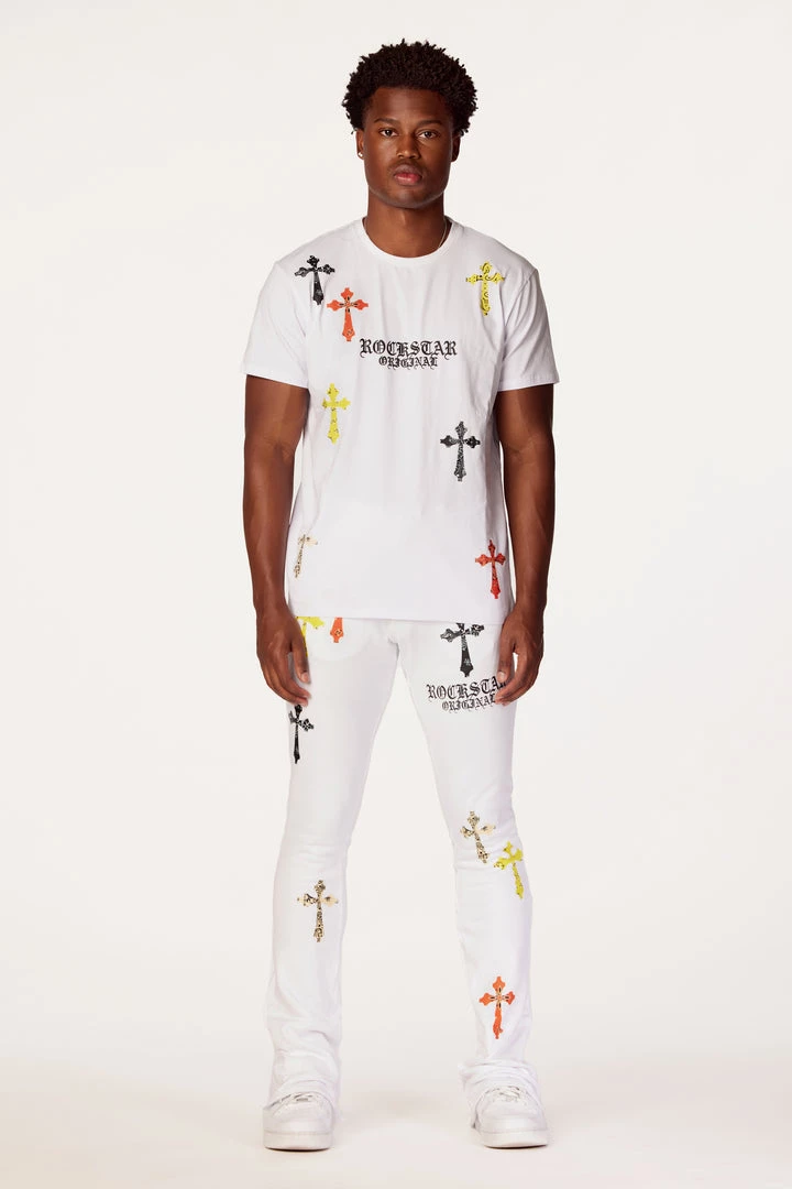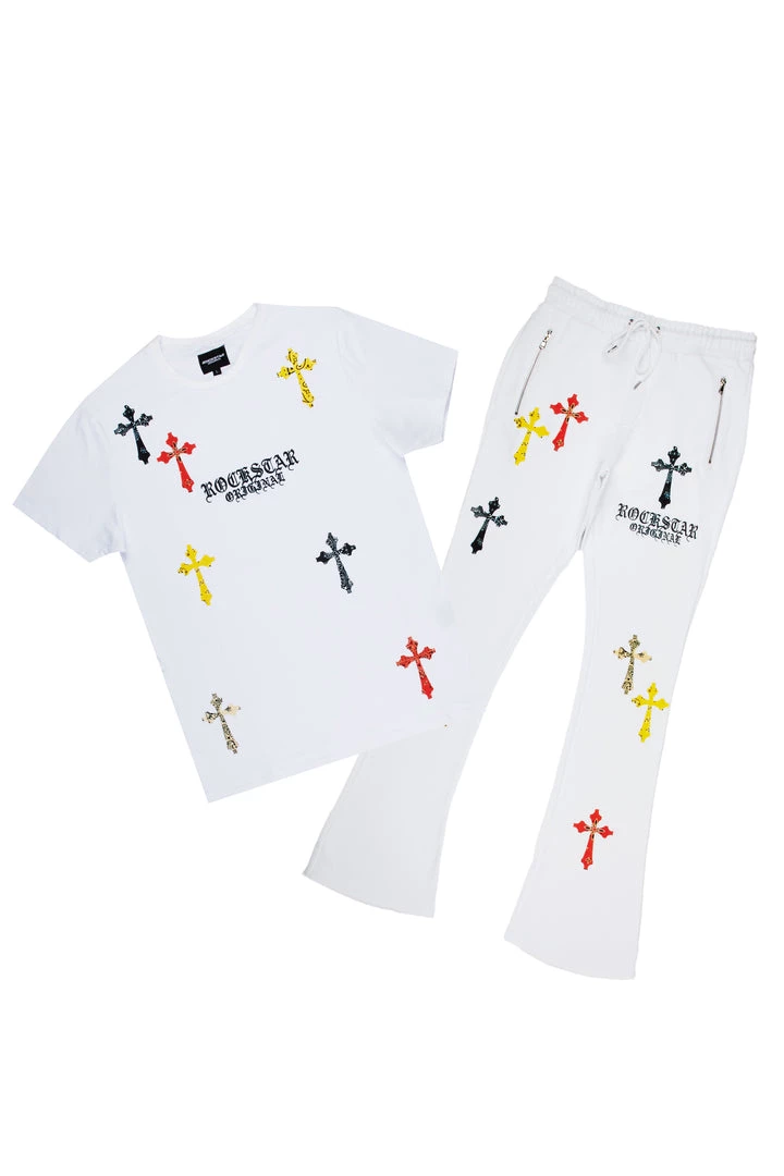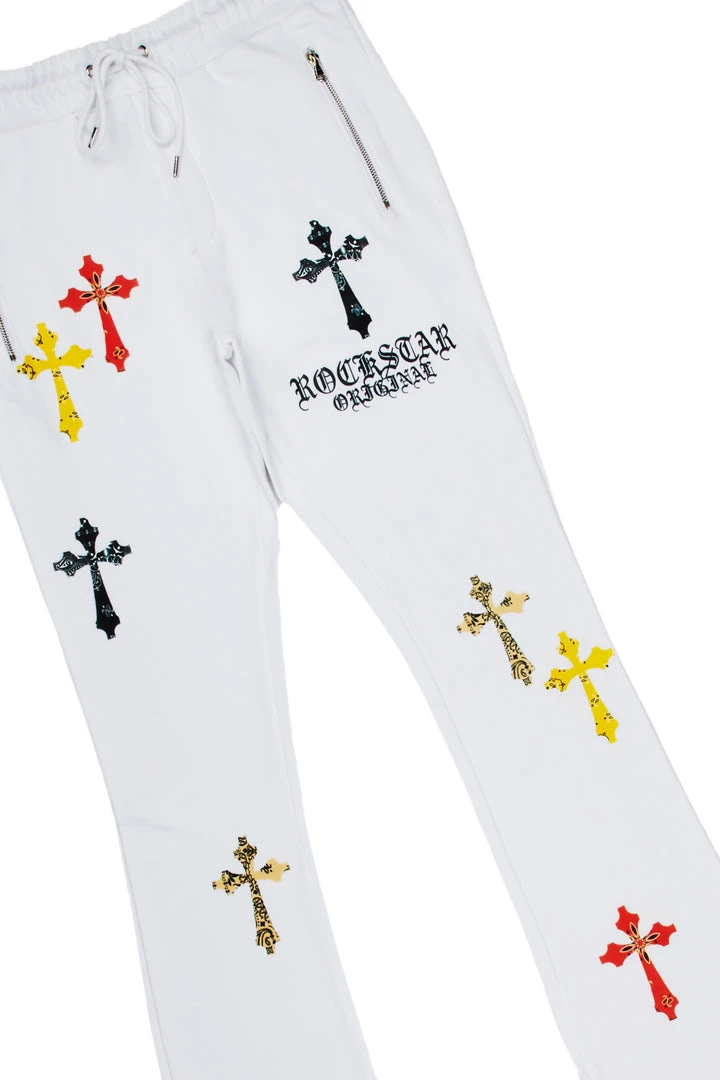 Rockstar Original Men’s two-piece tracksuit set in white. Featuring printed RSO logos with multi color paisley cross graphics throughout. Top accents a crewneck collar and relaxed fit while bottoms accent an elastic drawstring waistband, side pockets and flare hems.