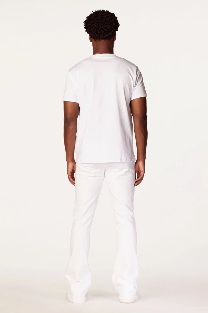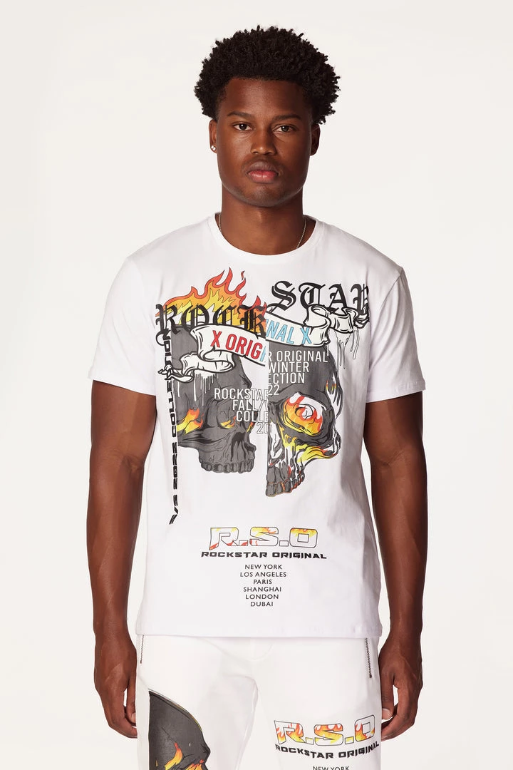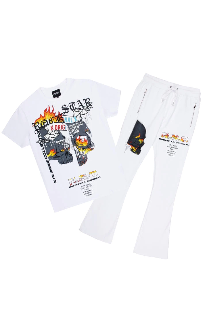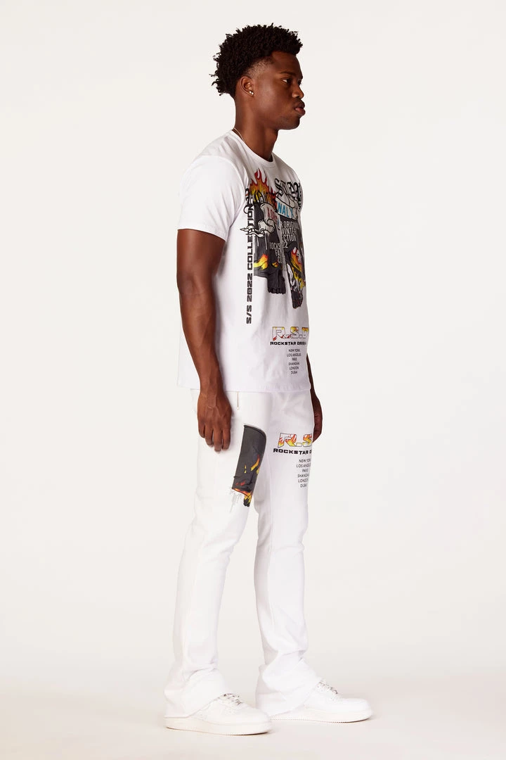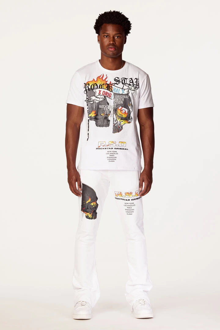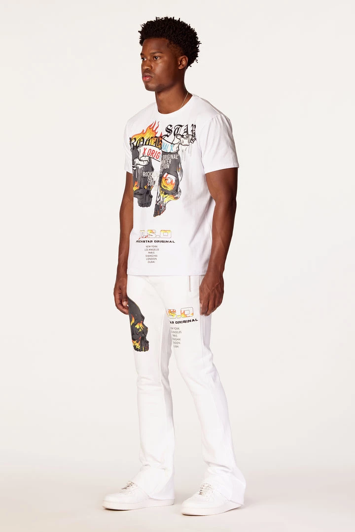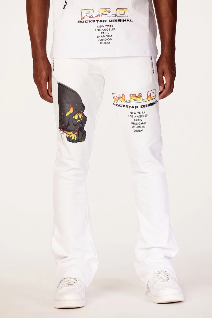 Rockstar Original Men’s two-piece tracksuit set in white. Featuring printed RSO logos with multi color custom graphics throughout. Top accents a crew neckline and relaxed fit while bottoms accent an elastic drawstring waistband, high-quality zipper pockets and flare hems.
