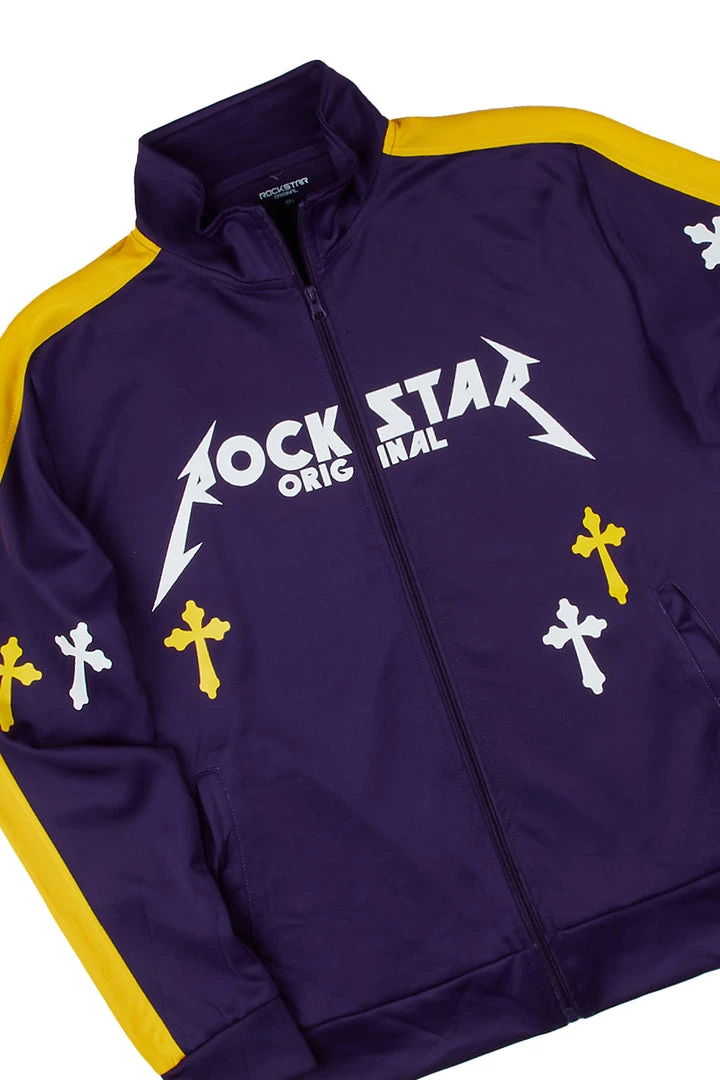 Rockstar Original Men’s two-piece tracksuit set in purple. Featuring printed RSO logos, a racer stripe finish and multi color cross graphics throughout. Designed as a lightweight wear with a high quality front zip stand-up collar closure and side pockets while bottoms accent a drawstring waistband, pockets throughout and ankle zipper inseams. Stay fresh with this effortless ‘fit.