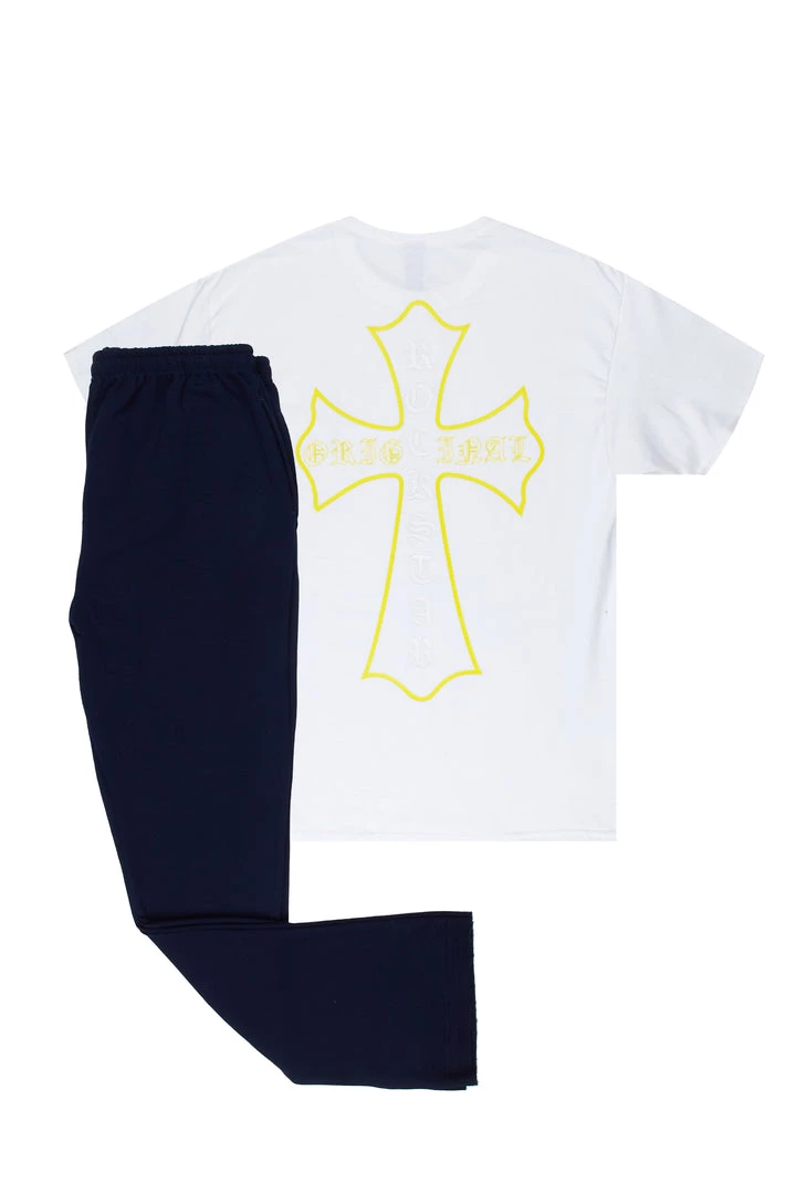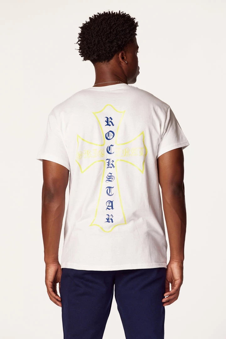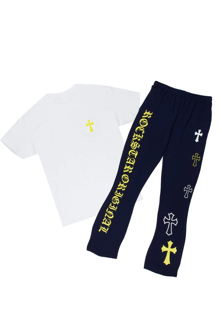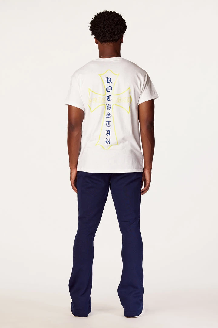 Rockstar Original Men’s two-piece tracksuit set in white. Featuring printed RSO logos in Old English and printed cross graphics on the top and bottom. Top accents a crewneck collar and relaxed fit while bottoms accent an elastic waistband, side pockets and flare hems.