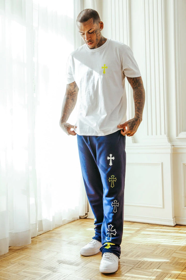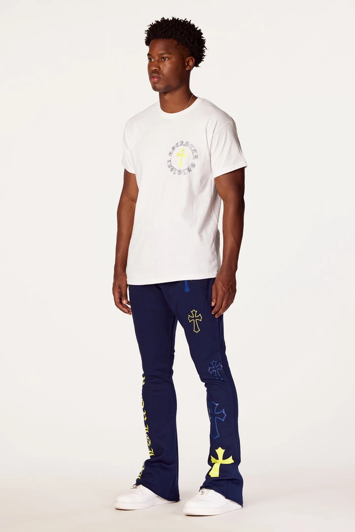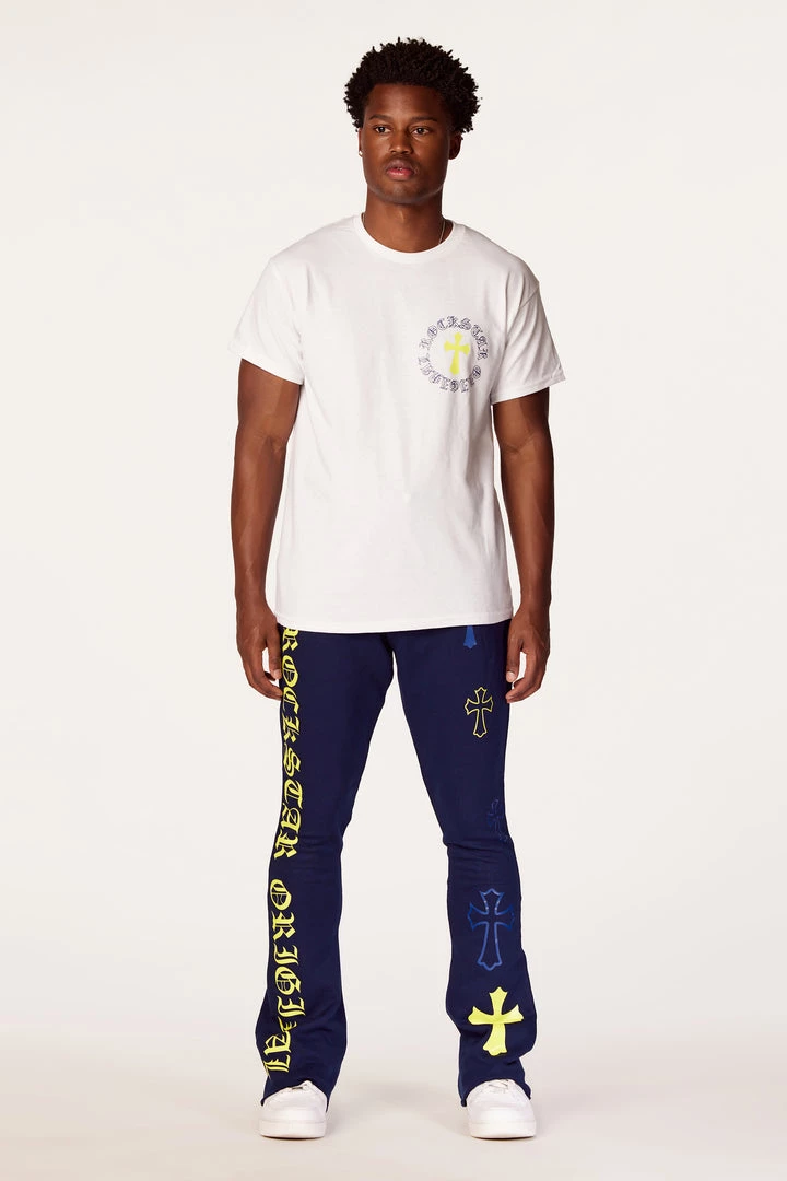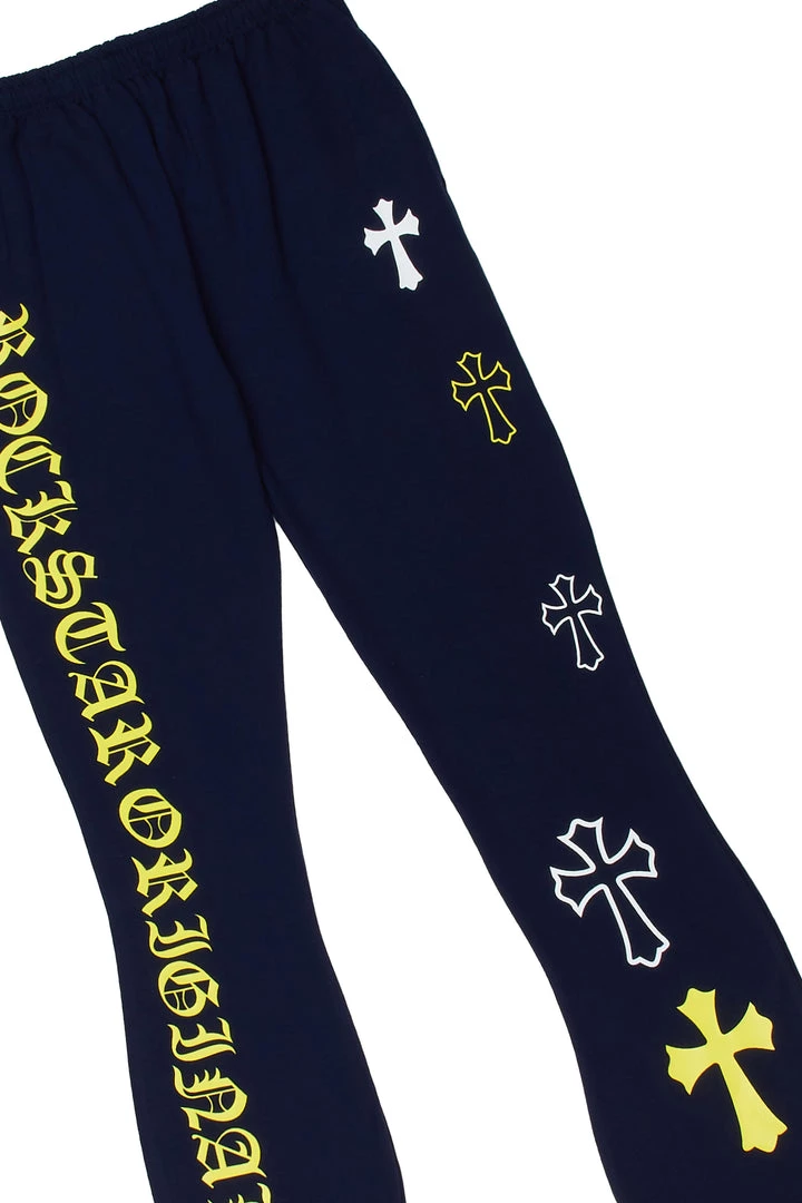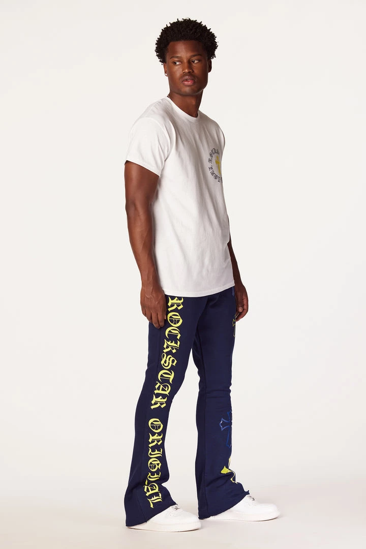 Rockstar Original Men’s two-piece tracksuit set in white. Featuring printed RSO logos in Old English and printed cross graphics on the top and bottom. Top accents a crewneck collar and relaxed fit while bottoms accent an elastic waistband, side pockets and flare hems.