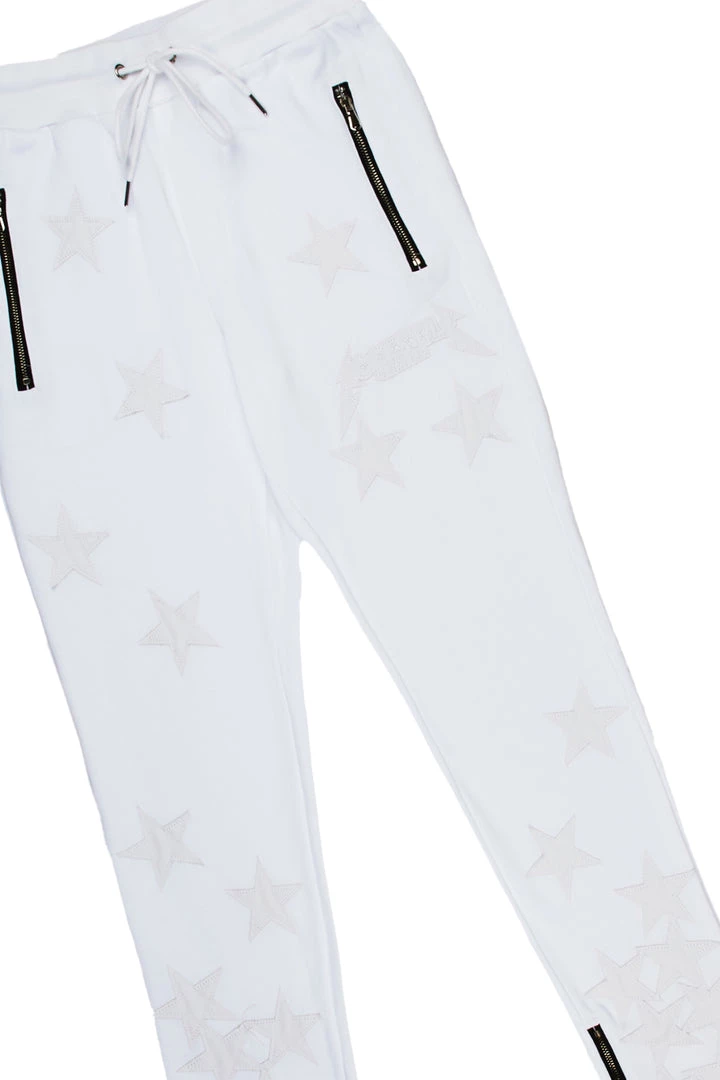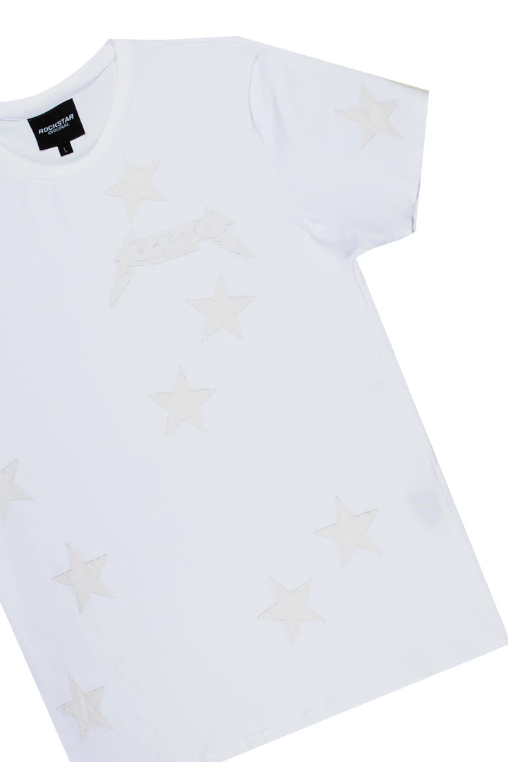Rockstar Original Men’s two-piece tracksuit set in white. Featuring embroidered RSO logos and stitched star graphics throughout. Top accents a crew neckline with short sleeves and a relaxed fit while bottoms accent a drawstring waistband, high-quality zipper pockets and ankle zipper inseams.