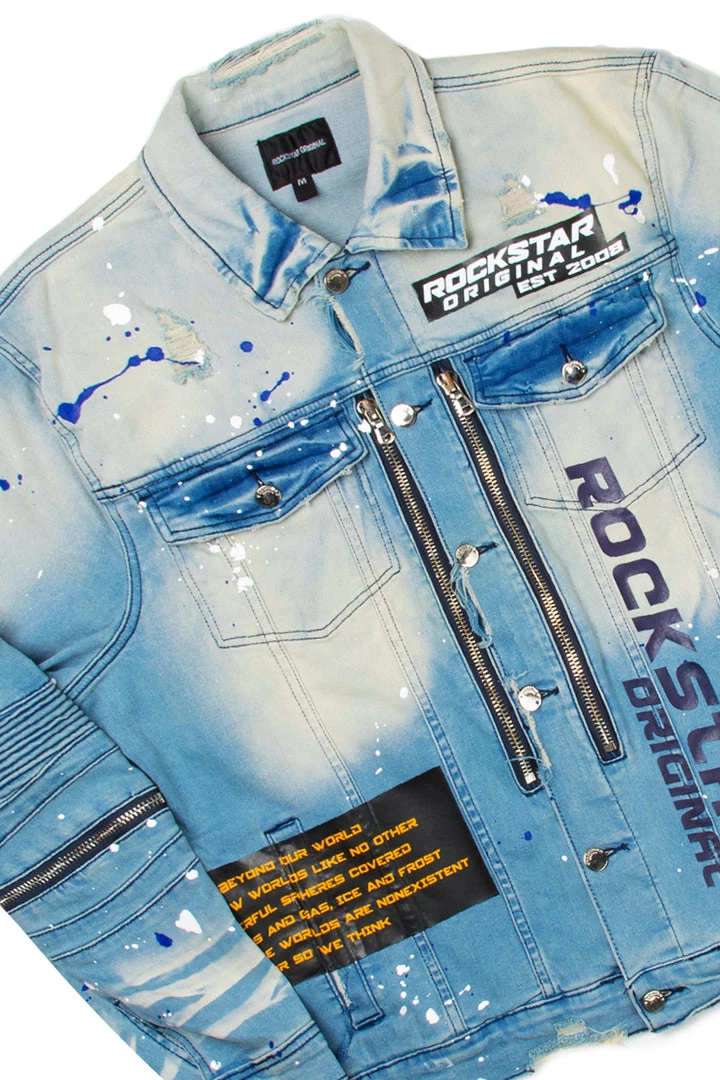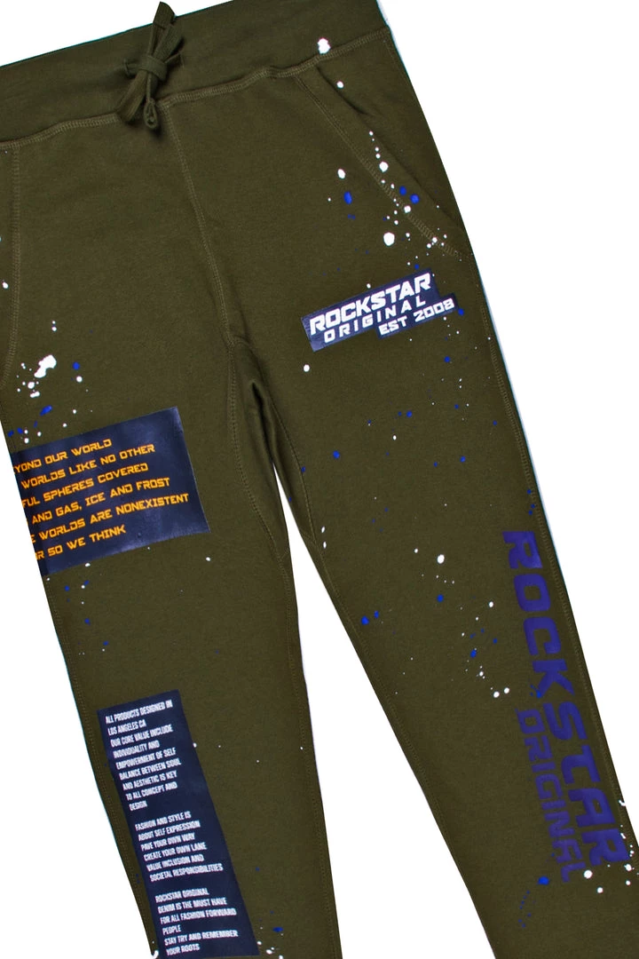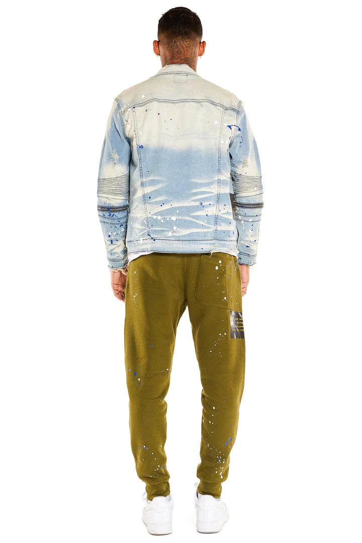 Rockstar Original Men’s denim jacket and track pant set. Featuring a medium wash denim on the top and olive green premium cotton threading on the bottoms with printed graphics and custom splatter paint throughout. Pants accent a drawstring waistband with cuffed hems while the jacket is made with high quality front button closure, dual chest pockets and zipper accents.
