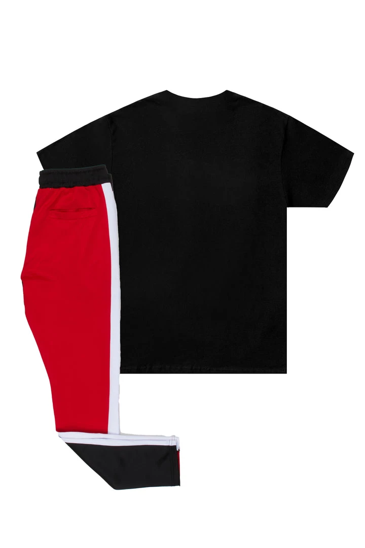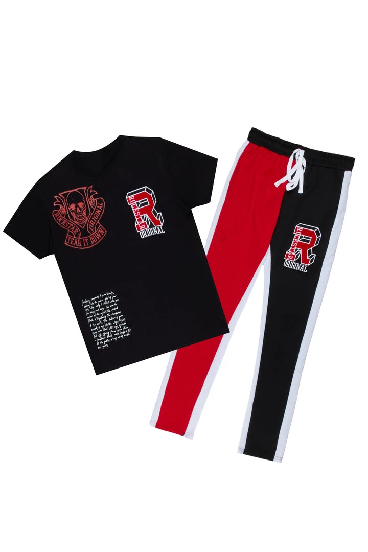 Rockstar Original Men’s two-piece tracksuit set in black and red. Featuring printed RSO varsity letters and graphics throughout the top and bottoms. Tee accents a crew neckline and relaxed fit while bottoms accent a duo tone color block design with a drawstring waistband, multiple pockets and ankle zipper inseams.