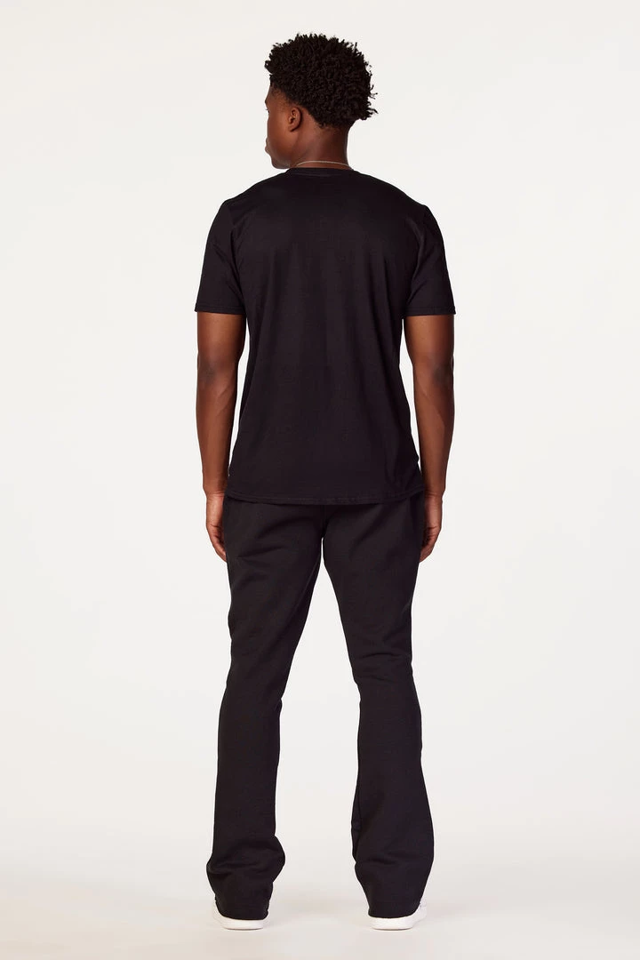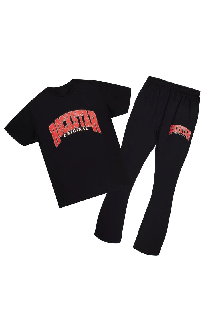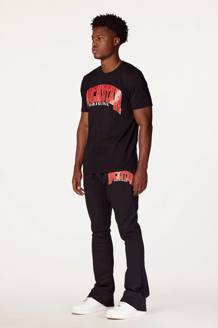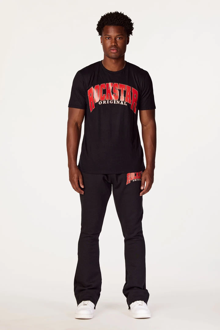 Rockstar Original Men’s two-piece tracksuit set in black. Featuring printed RSO logos on the top and bottoms. Top accents a crew neckline and relaxed fit while bottoms accent an elastic drawstring waistband, side pockets and flare hems.