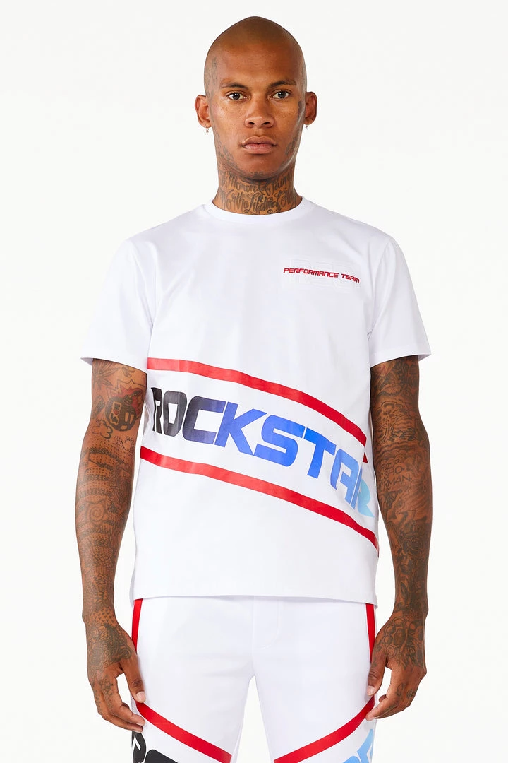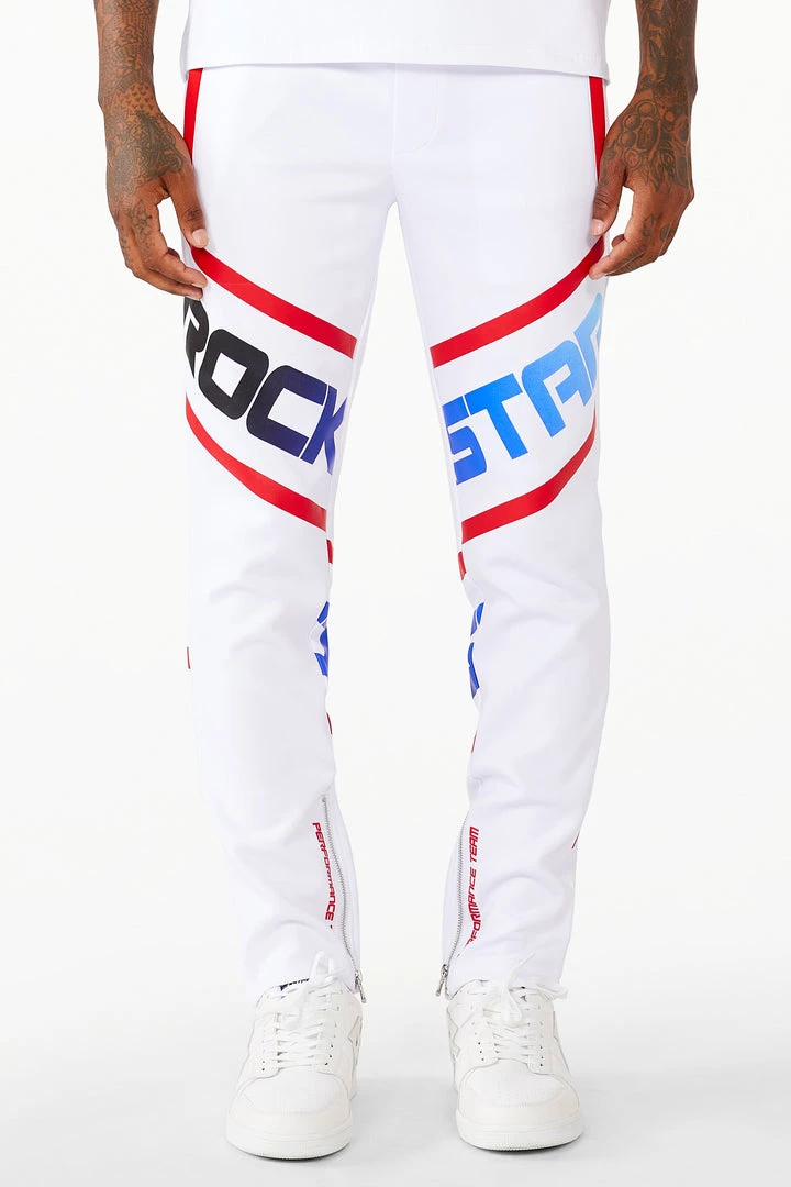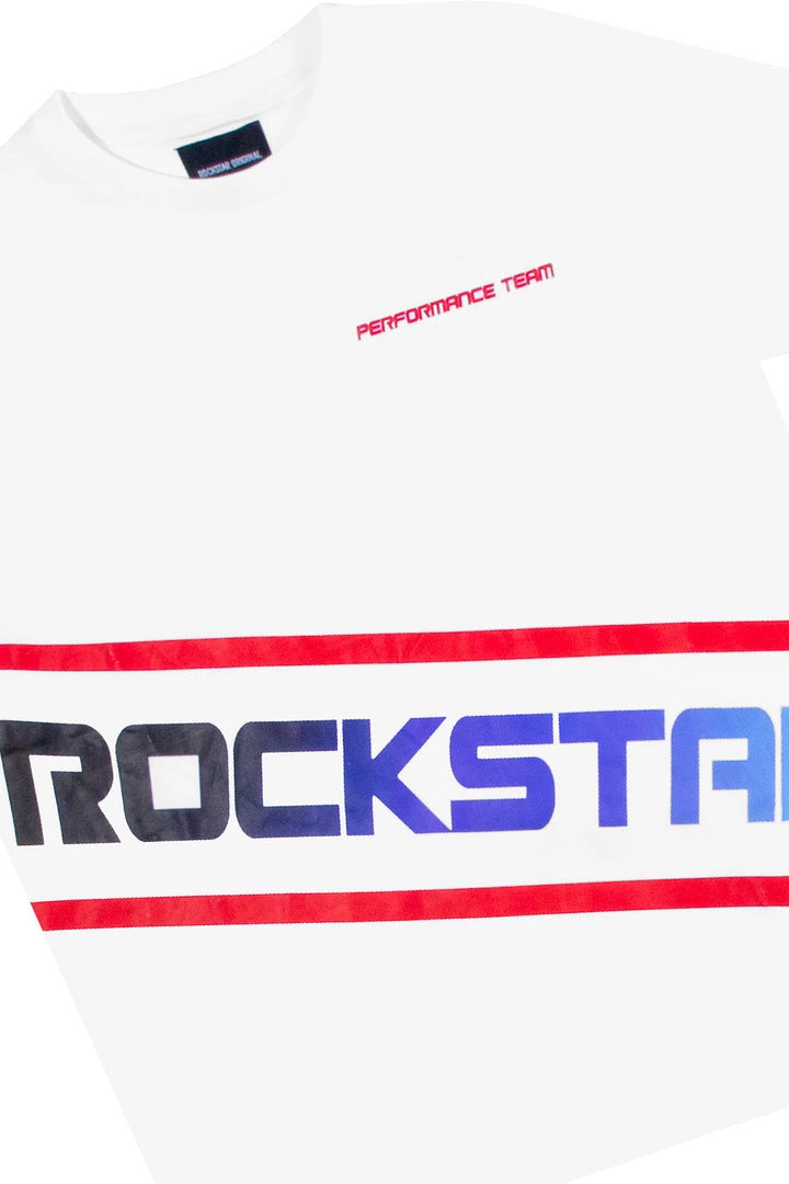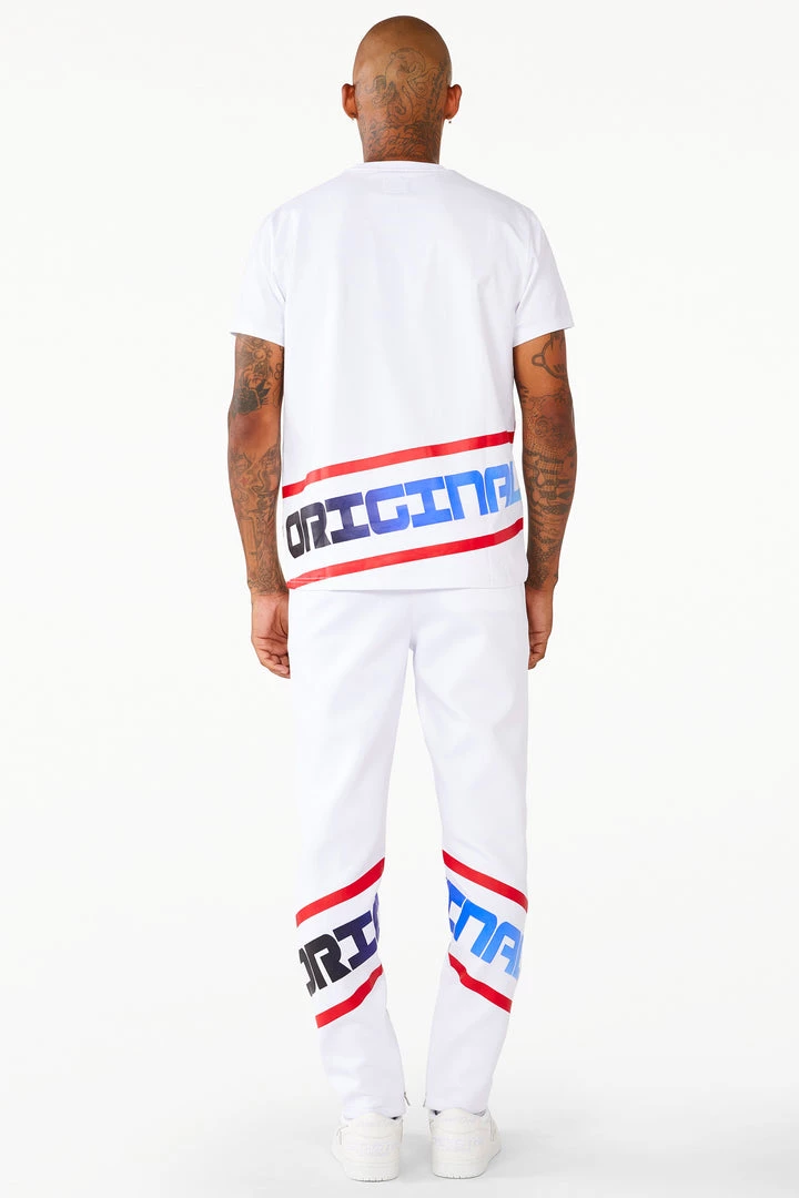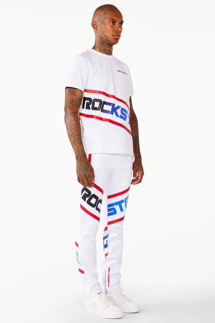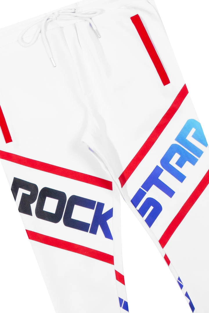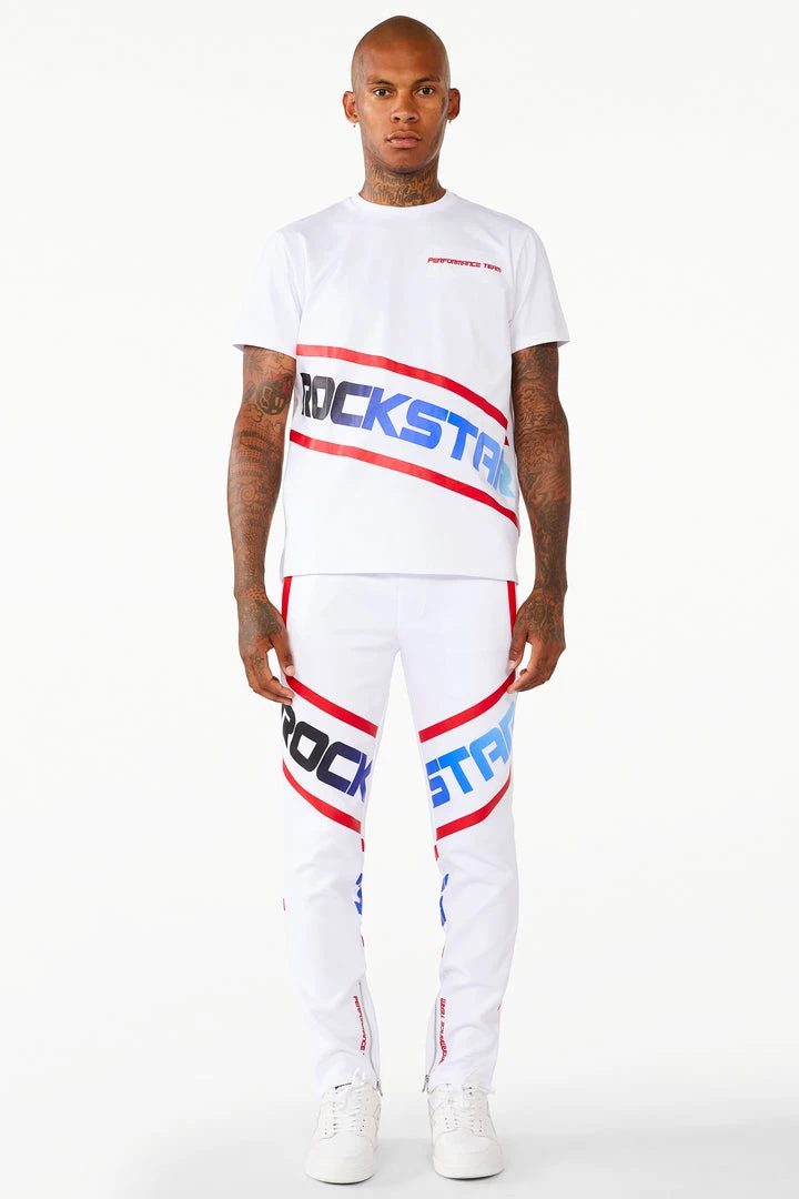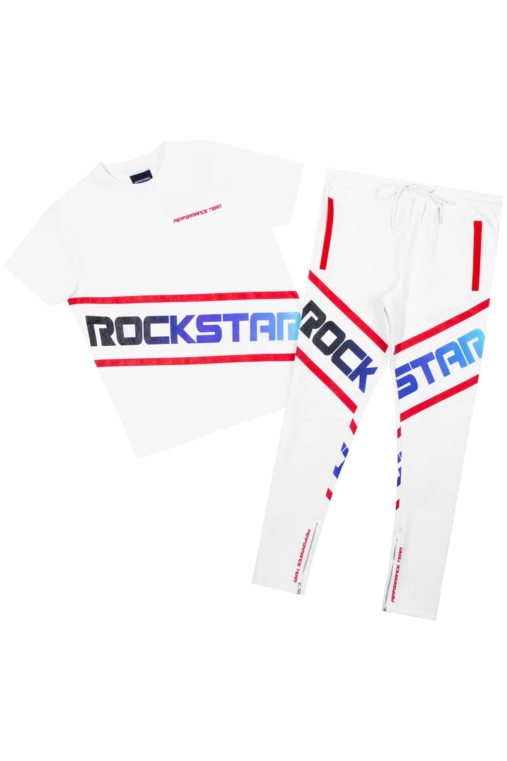 Rockstar Original Men’s tracksuit set in white. Featuring an ombre style graphic printed RSO logo on the top and bottom with racer stripes throughout. Shirt accents a crew neckline while bottoms accent a drawstring waistband, side pockets and ankle zipper hems.