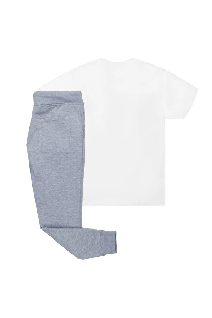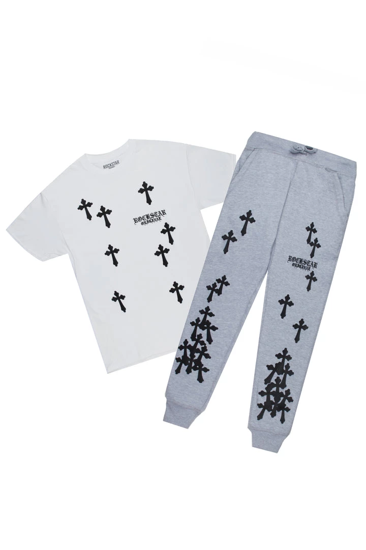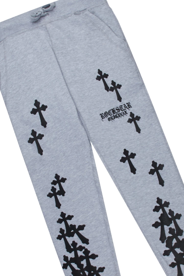Rockstar Original Men’s two-piece tracksuit set in grey. Featuring a printed RSO logo in Old English and printed cross graphics on the top and bottom. Top accents a crewneck collar and relaxed fit while bottoms accent a drawstring waistband, side pockets and elastic cuffs.