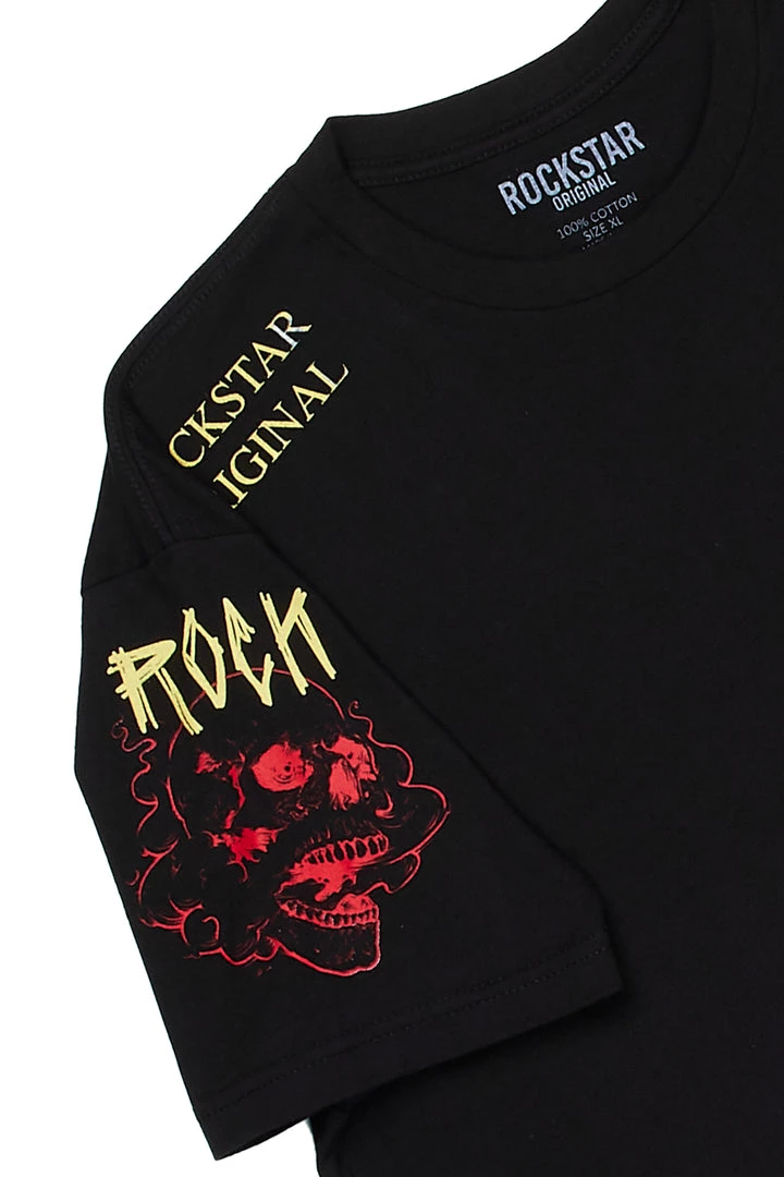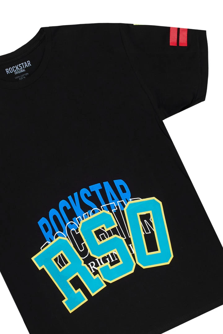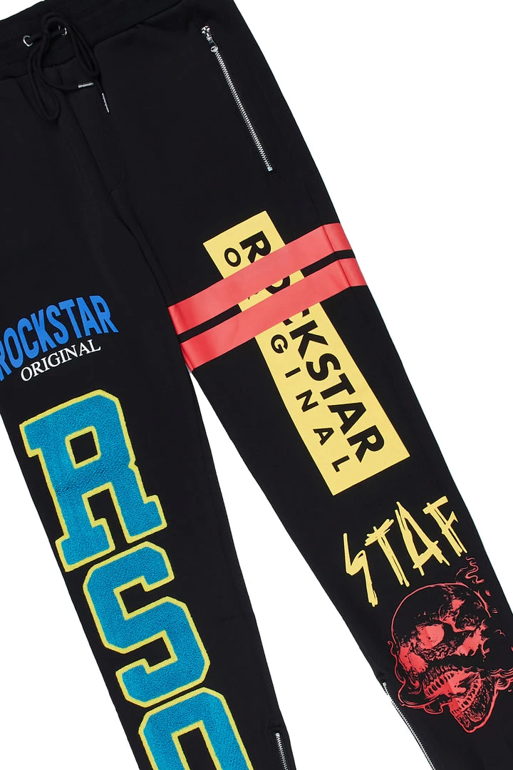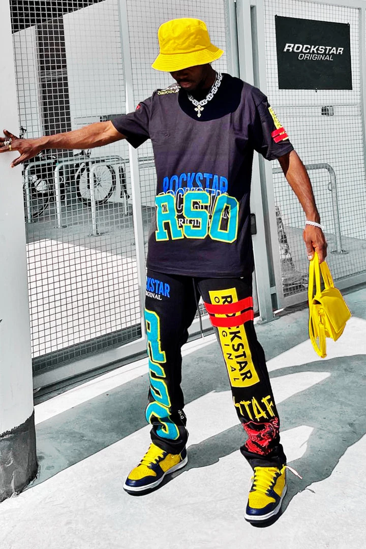 Rockstar Original Men’s two-piece tracksuit set in black. Featuring printed multi color and multi font RSO logos and custom graphics throughout. Top accents a crew neckline with short sleeves and a relaxed fit. Bottoms accent an embroidered RSO logo at the lower leg with a drawstring waistband, high-quality zipper pockets and ankle zipper inseams.