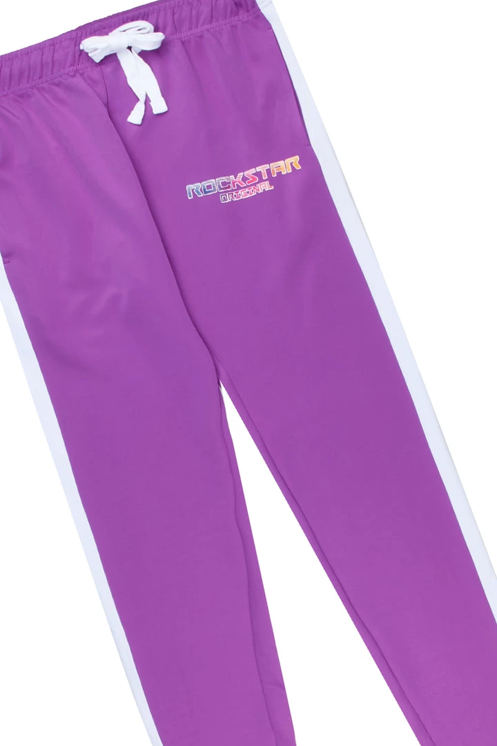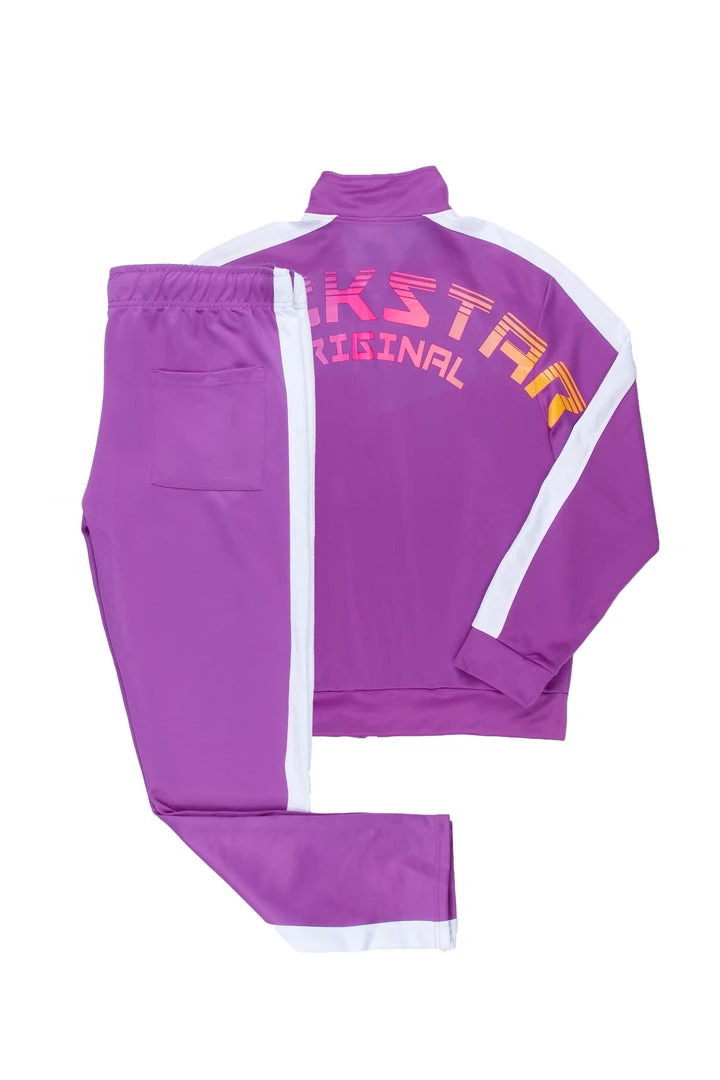 Rockstar Original Men’s two-piece tracksuit set in purple. Featuring ombre style printed RSO logos and a racer stripe finish throughout. Designed as a lightweight wear with a high quality front zip stand-up collar closure and side pockets while bottoms accent a drawstring waistband, pockets throughout and ankle zipper inseams. Stay fresh with this effortless ‘fit.