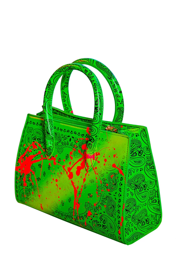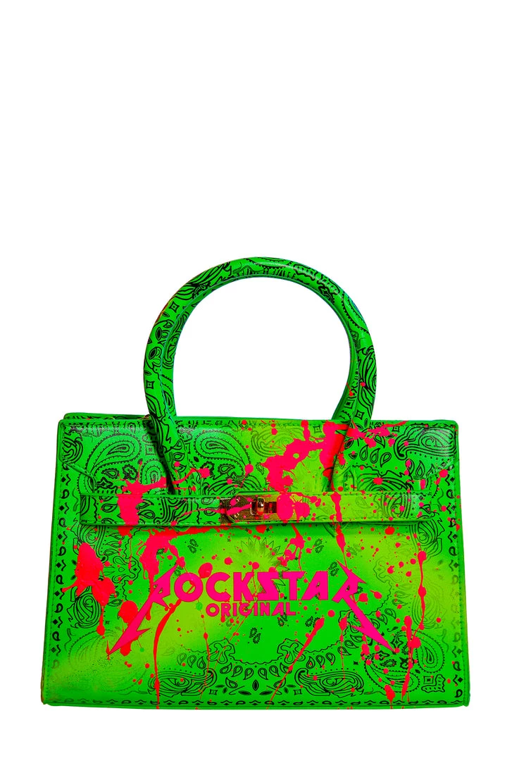 Rockstar Original Women’s bag featuring a gorgeous faux leather paisley print design in popping neon green. Accenting a matching print strap, RSO logos, and bold paint splatters.