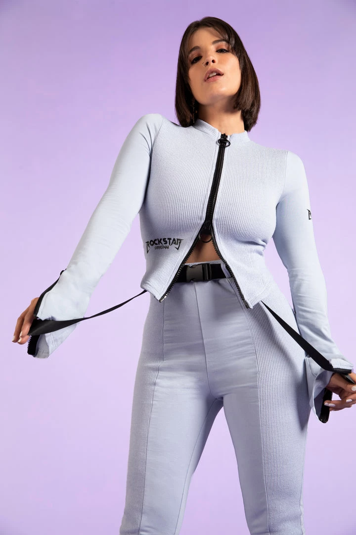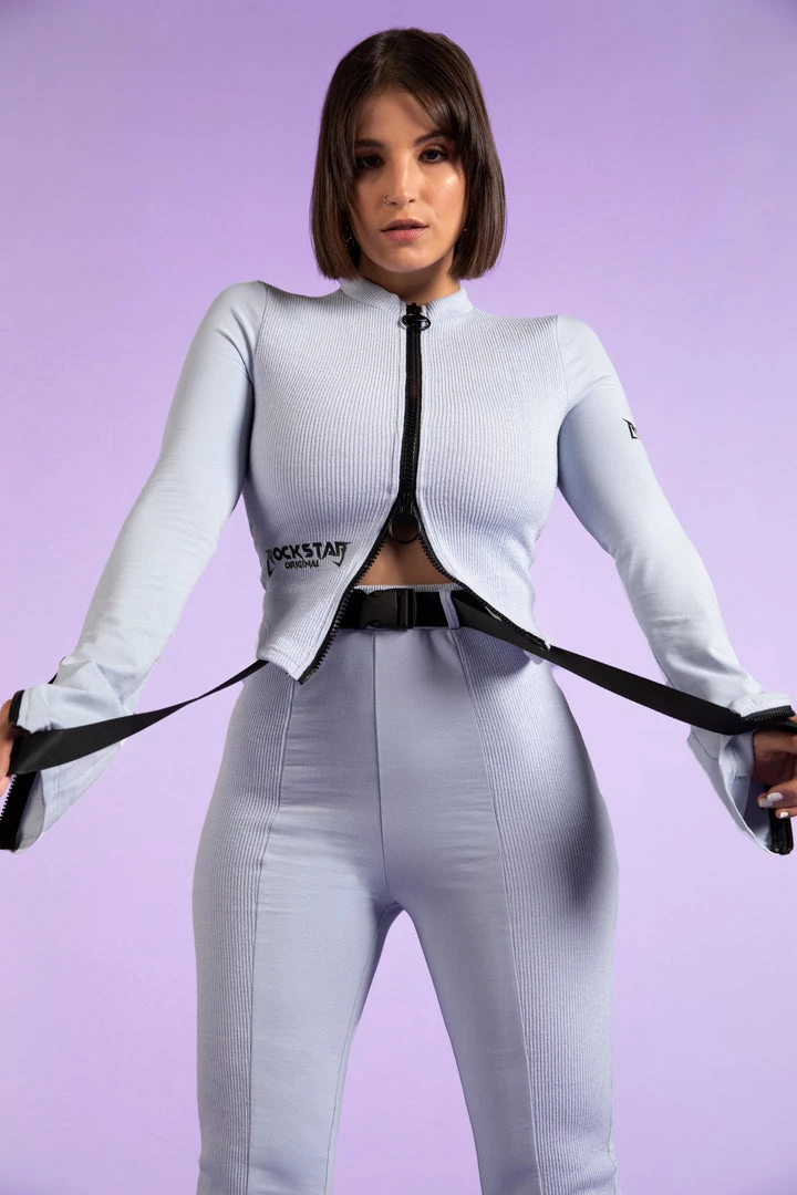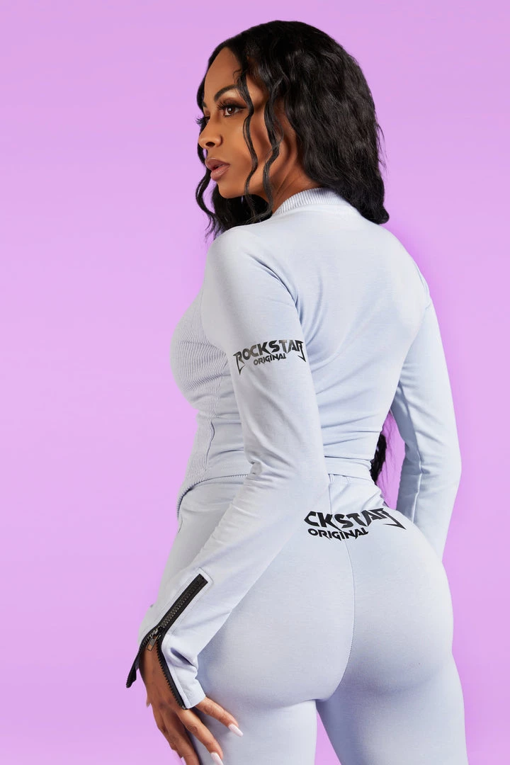 Rockstar Original Women’s grey ribbed and paneled active set with hanging belt straps, molded front zipper, curved bustier front hem and matching legging.