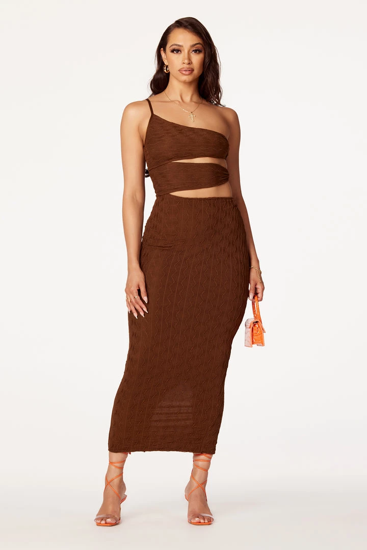 Rockstar Original Women’s maxi dress in brown. Featuring a one-shoulder design with cut-out styling throughout. Accenting a ribbed knit material finish with O-rings. Style with strappy heels for a gorgeous OOTD!