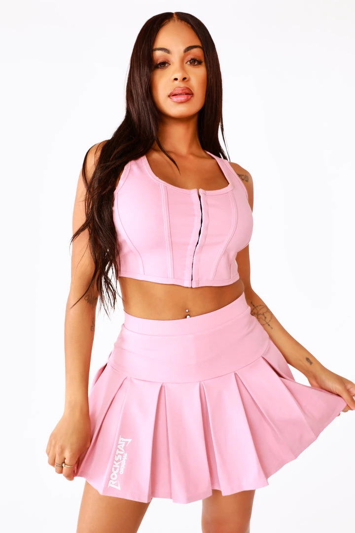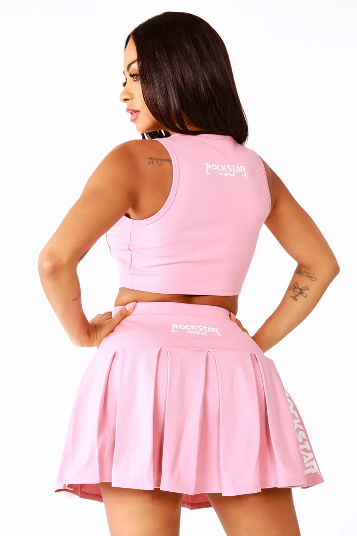 Rockstar Original Women’s two-piece corset tank top and cheerleader paneled skirt set with bold Rockstar Original logos.