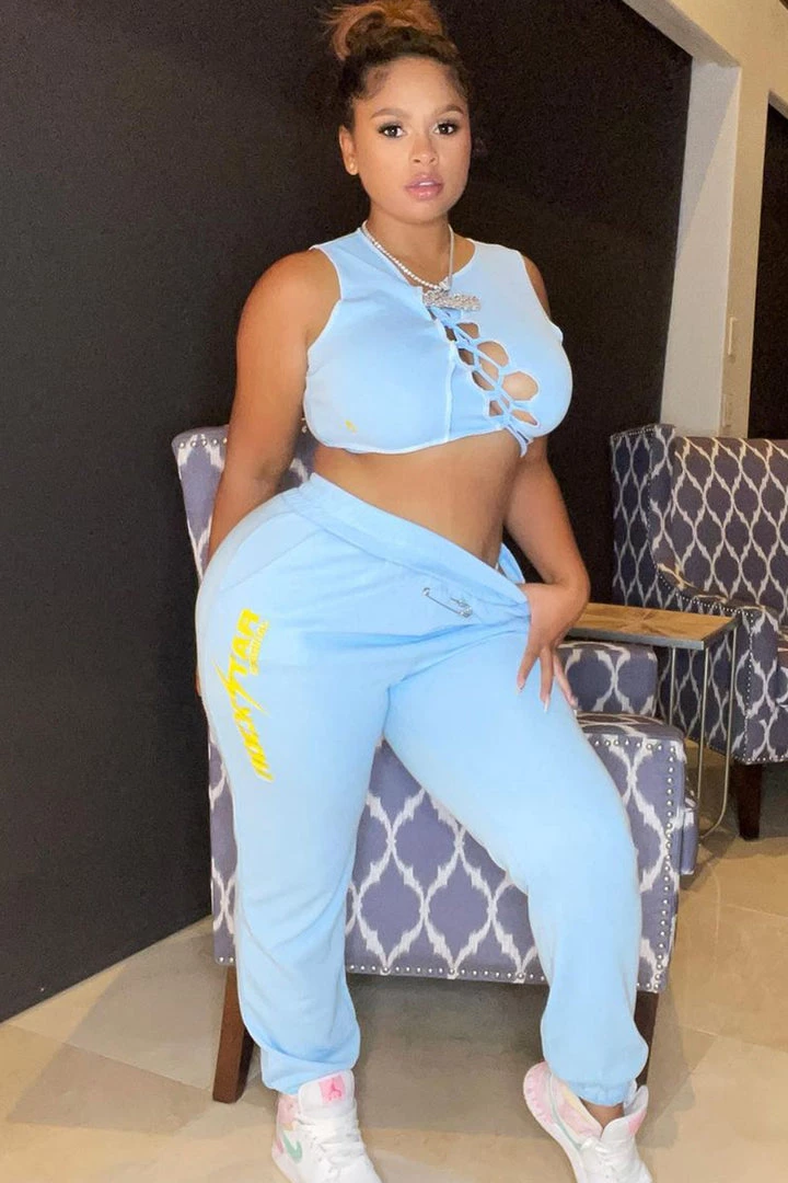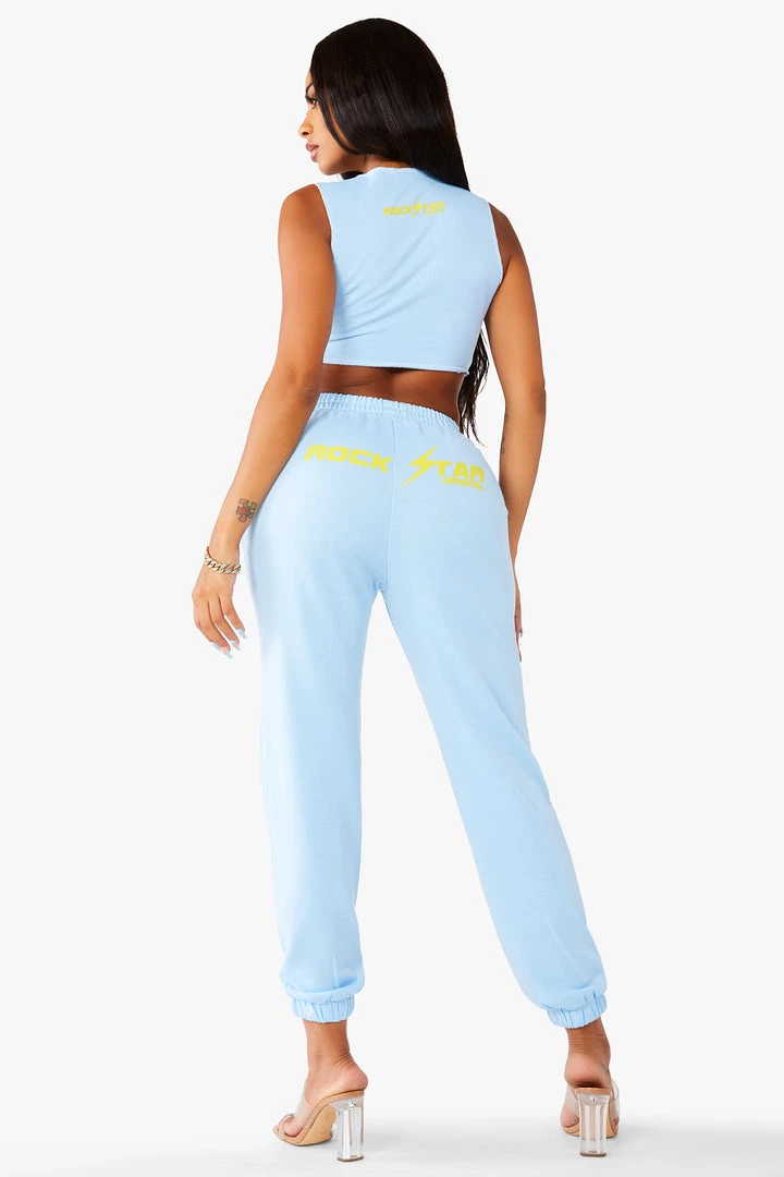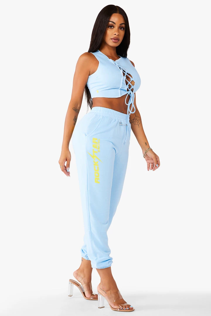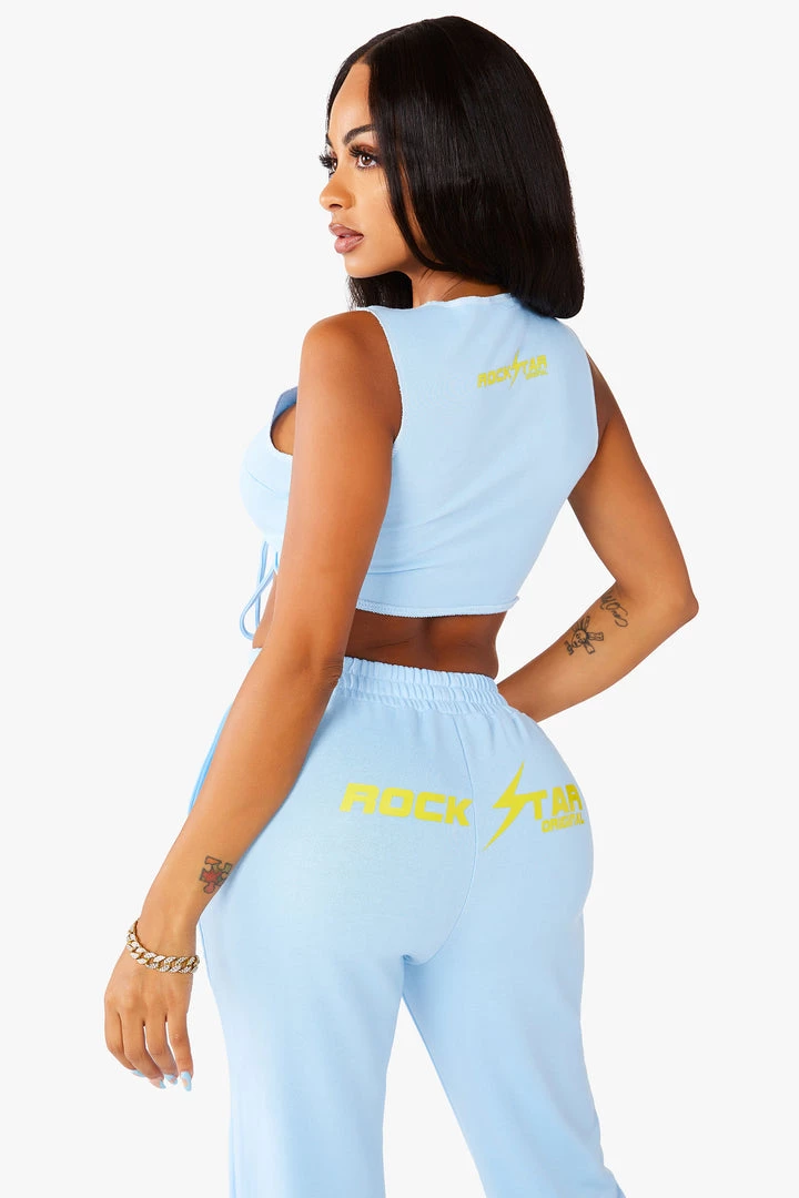 Rockstar Original Women’s tied tank top and sweatpants with pin detailing and soft yellow Rockstar Original logos.