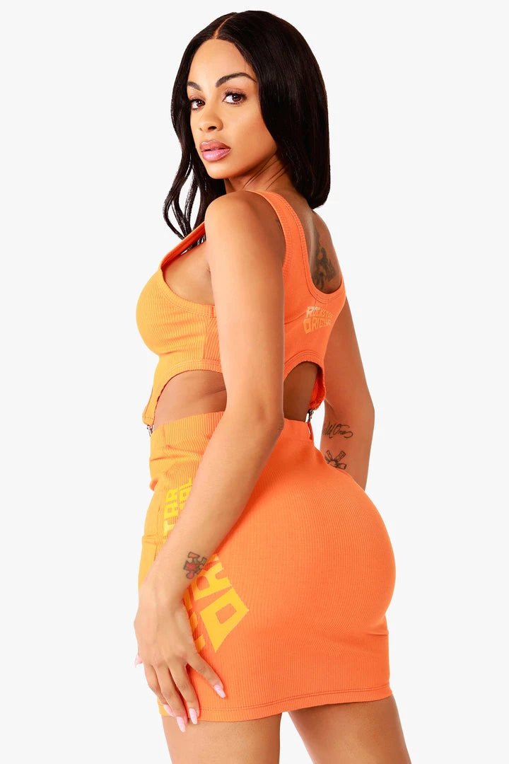Rockstar Original Women’s mini dress with metal clips at the waist and bold Rockstar Original curved logos.