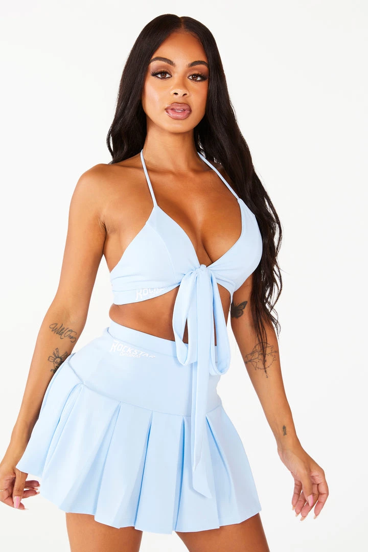Rockstar Original Women’s two-piece tie-front bralette top and cheerleader skirt set with soft Rockstar Original photos.