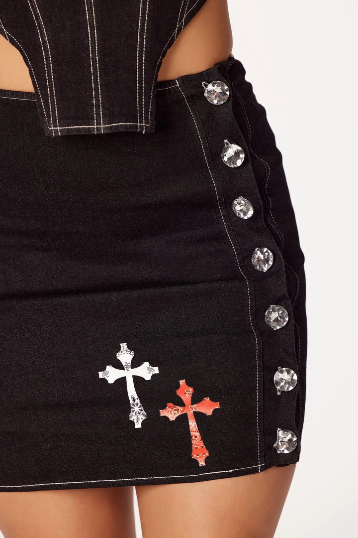Rockstar Original Women’s two-piece denim skirt set in black. Featuring a printed RSI logo on the top with cross graphics on the skirt. Top accents a straight neckline with thick straps, a patterned, cropped hem and a posterior zipper closure. Skirt accents a side diamond button closure with a mini length and a form-fitting silhouette,