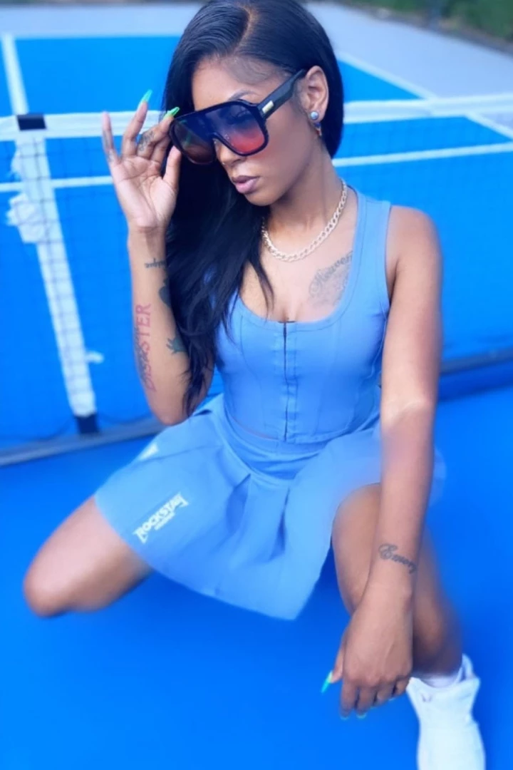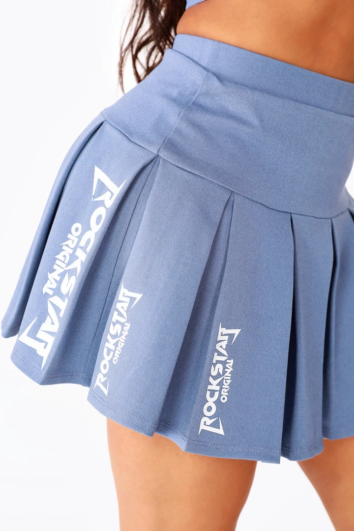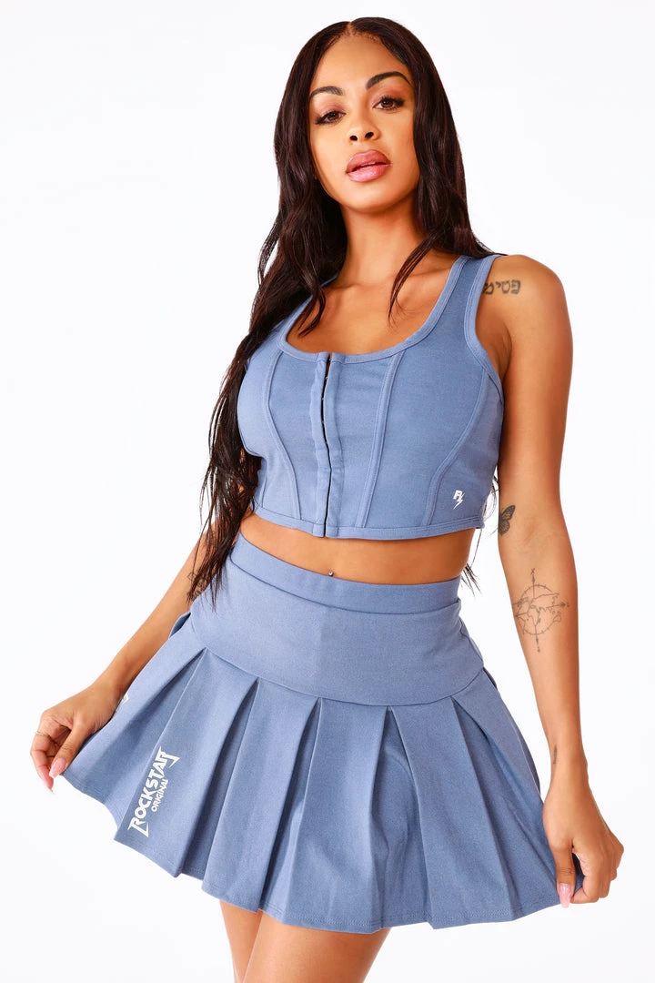 Rockstar Original Women’s two-piece corset tank top and cheerleader paneled skirt set with bold Rockstar Original logos.