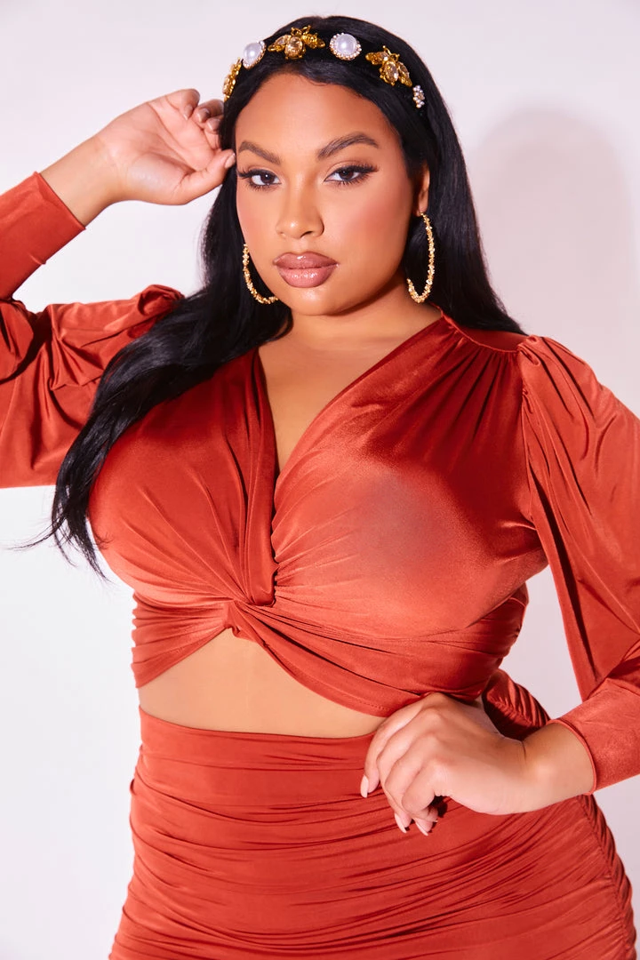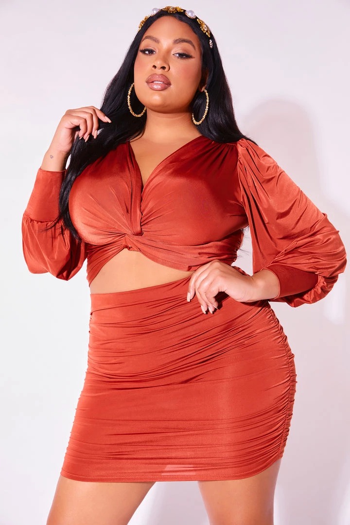 Rockstar Original Women’s crop top two-piece set in beautiful bronze. Featuring a collared styled long sleeve knot tie top with button cuffs and a bodycon scrunch skirt to match. This tone setting two-piece is the perfect staple piece set to up your fit game for any event.