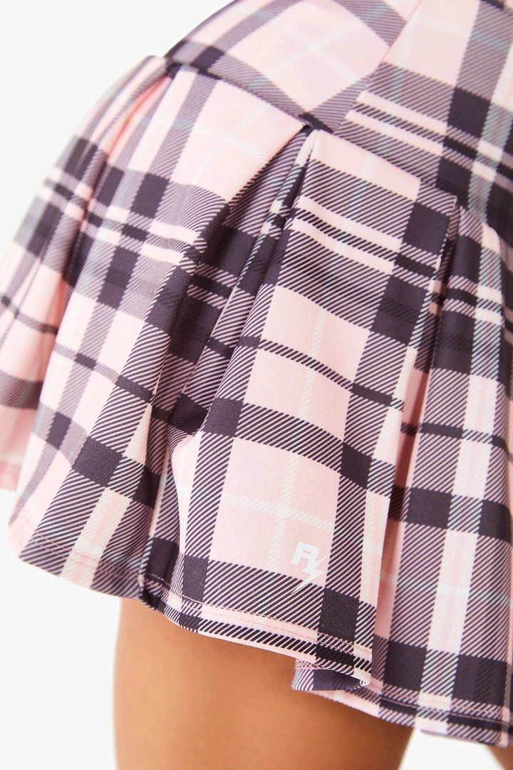 Rockstar Original Women’s tie-front short sleeve plaid top and cheerleader skirt set with small Rockstar Original logos.