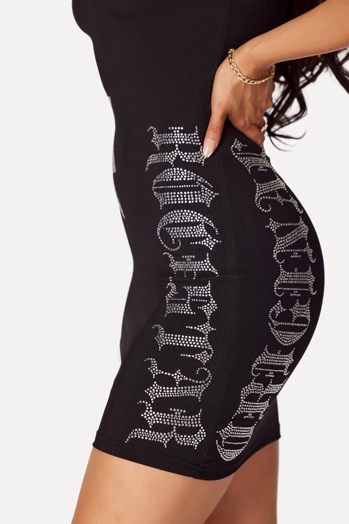 Rockstar Original Women’s dress in black. Featuring a scoop neckline with a printed RSO logo on the chest and glitter graphic. Accenting a form-fitting silhouette and a midi length with premium cotton for a comfortable staple piece.