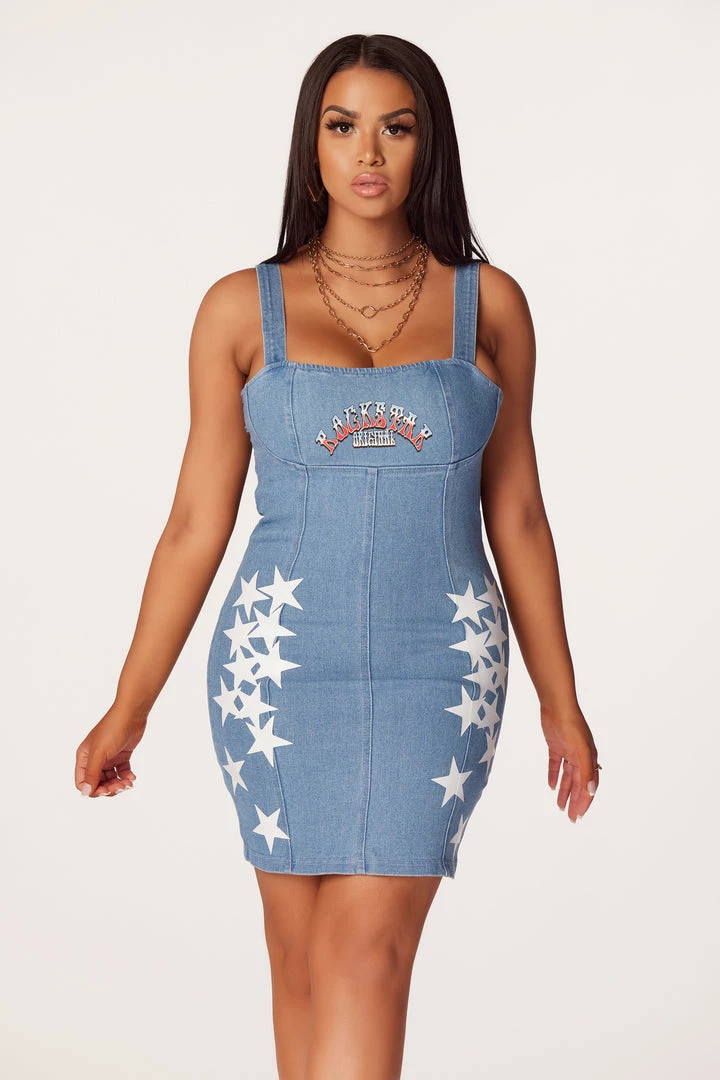 Rockstar Original Women’s denim dress in light wash. Featuring a printed RSO logo across the bust with cross graphics throughout. Accenting thick straps, high quality posterior zipper closure and a mini length.