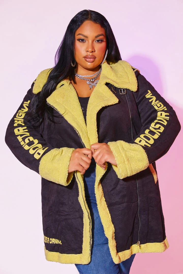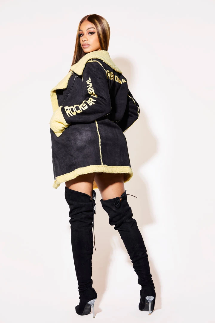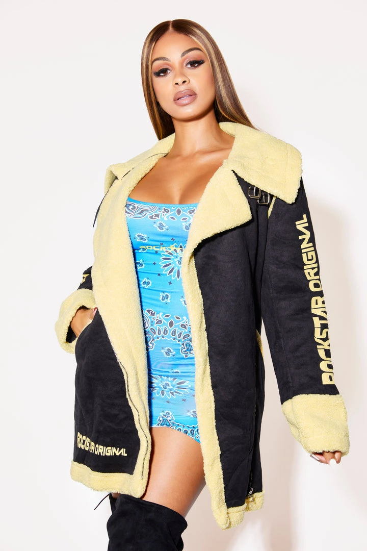 Rockstar Original Women’s sherpa jacket with outer suede-like fabric in black and inner yellow tone sherpa jacket with moto details including front zip and Rockstar logos.