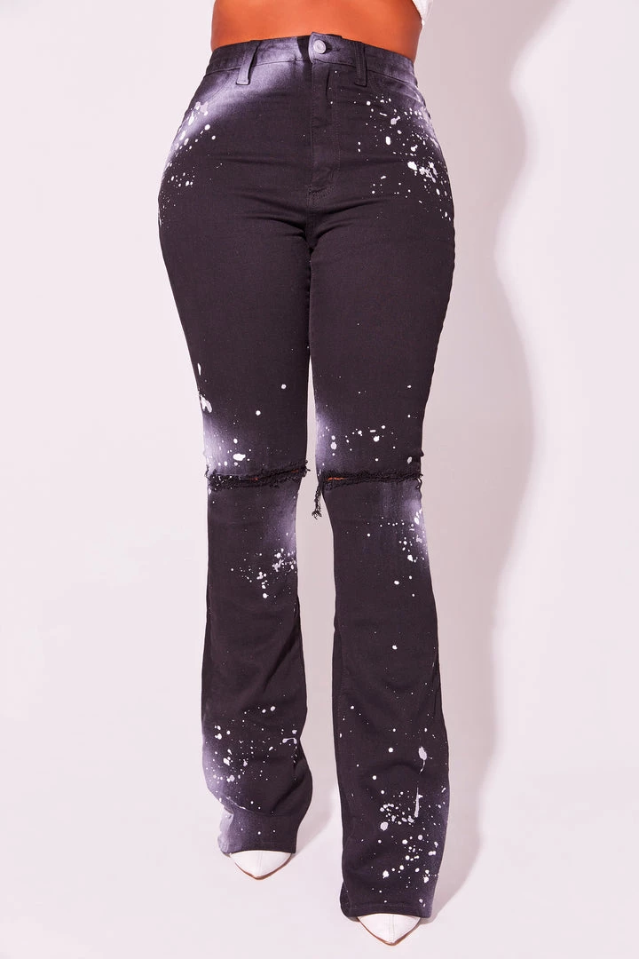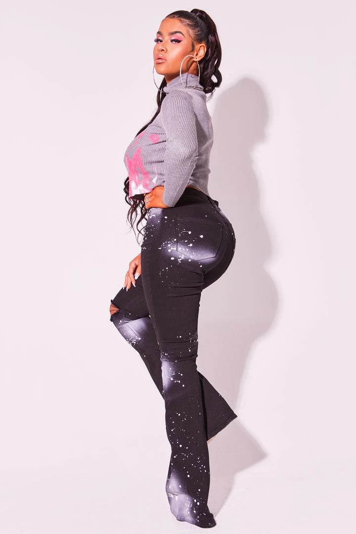 Rockstar Original Women’s denim jean in black. Featuring a high-waisted, flare silhouette with a high quality front button closure. These must-have jeans accent custom splatter paint designing and premium cotton threading for style that will move with you and for you as you command all the attention!