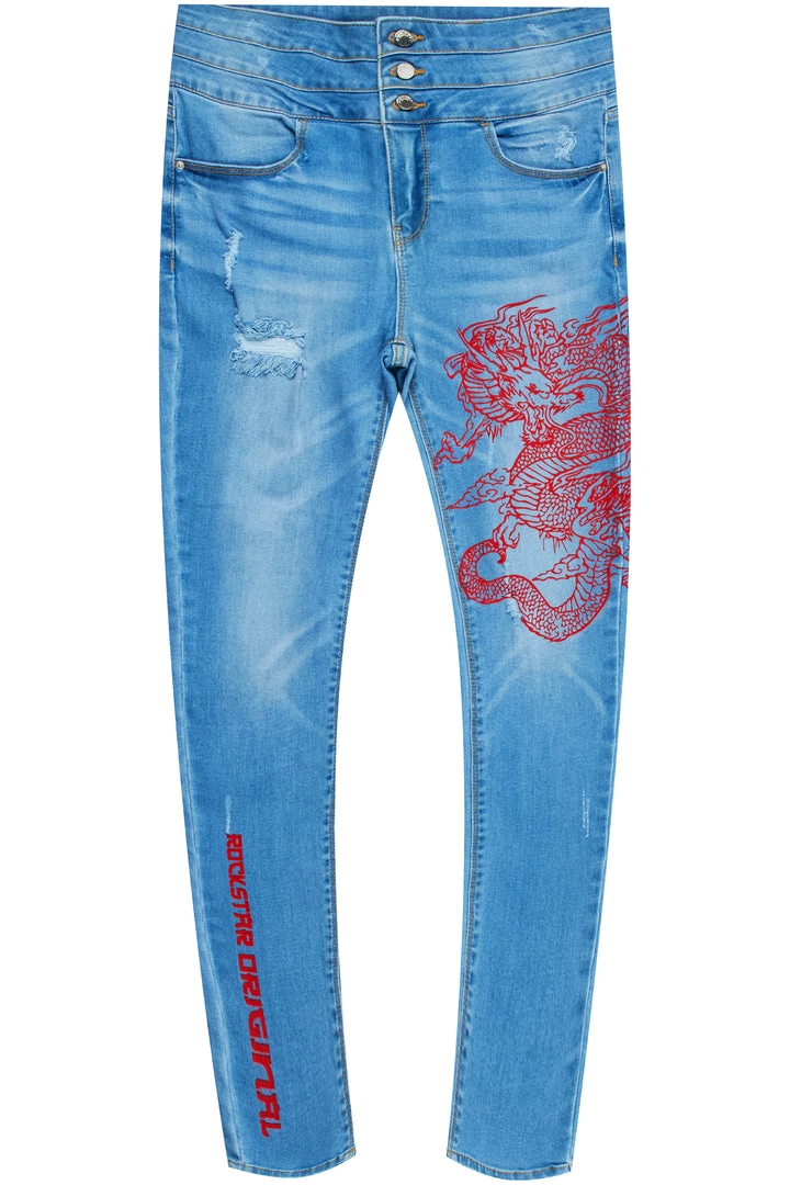 Rockstar Original Women’s denim jean in medium wash. Featuring a RSO logo at the ankle with a graphic print design and distressed detailing. Style with nude heels and be the center of attention in any social setting with these must-haves!