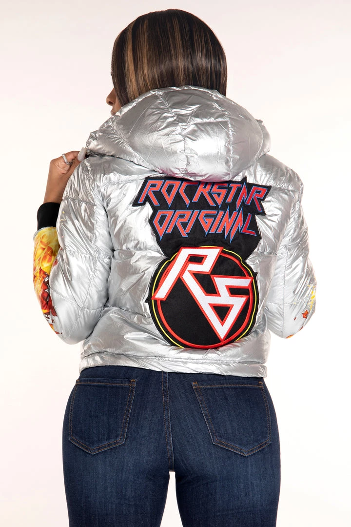 Rockstar Original Women’s crop puffer jacket in gorgeous silver. Featuring an embroidered front and posterior RSO logo with bold flame graphics on the sleeves. Accenting versatile material to keep you cool, comfortable, functional and fashionable. This new must-have bubble coat is styled with a drawstring fastening hood and hem, zipper pockets and a high quality zipper closure. Turn up the heat this winter season!