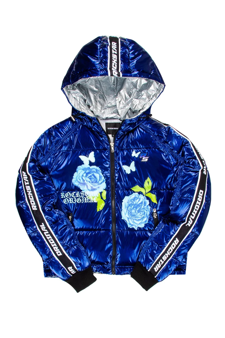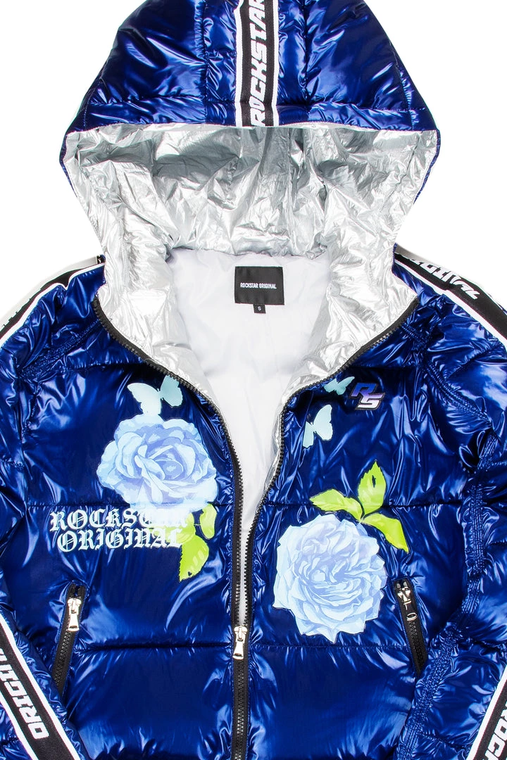 Rockstar Original Women’s crop puffer jacket in metallic blue. Featuring embroidered RSO logos on the sleeves with printed floral and butterfly graphics throughout — your winterwear game will level up with this piece. Accenting versatile material to keep you cool, comfortable, functional and fashionable. This new must-have bubble coat is styled with a drawstring fastening hood, high quality zipper pockets and a zipper closure. Turn up the heat this winter season!