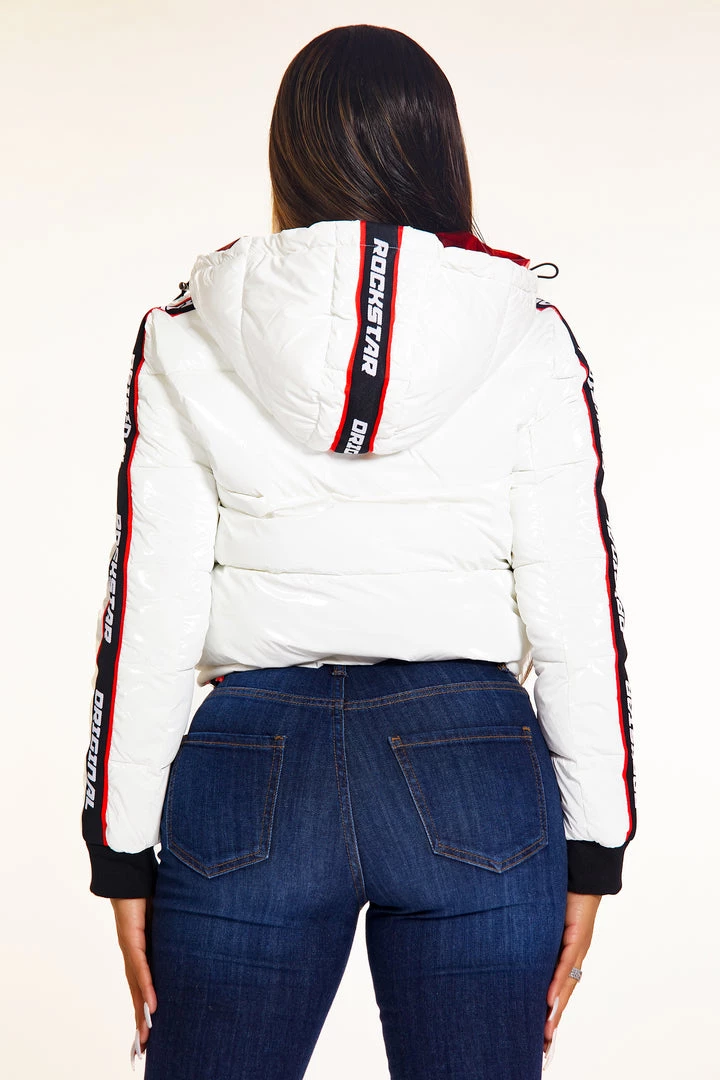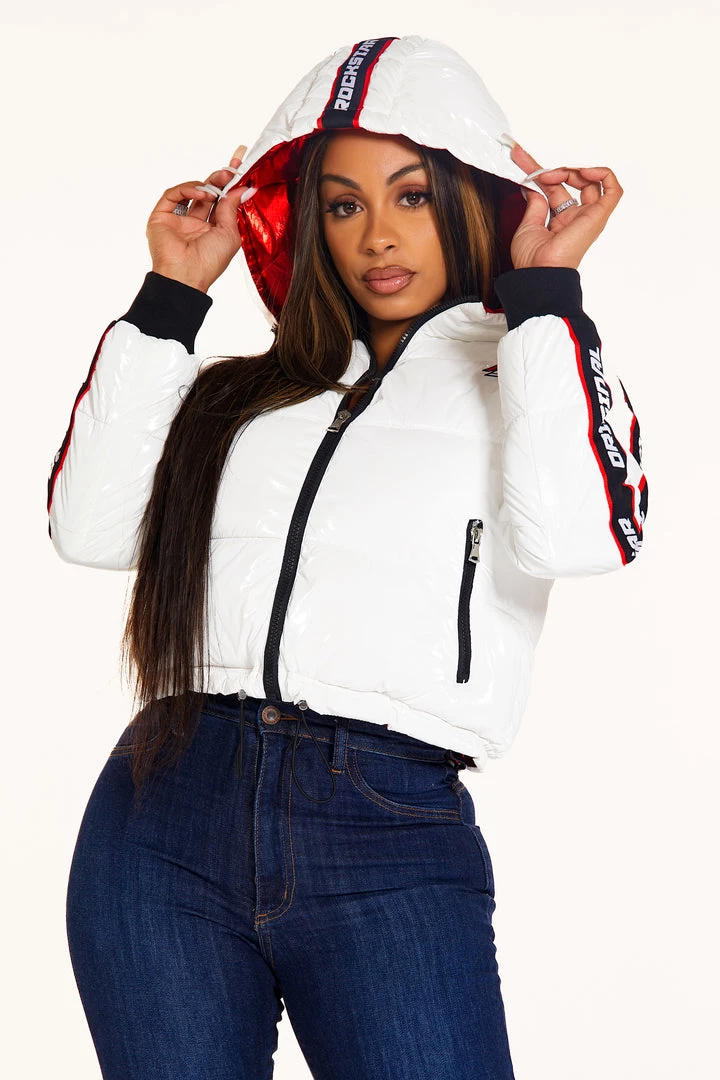 Rubi Rose x Rockstar Original Women’s crop puffer jacket in pure white. Featuring embroidered RSO logos on the sides of the sleeves — your winterwear game will level up with this piece. Accenting versatile material to keep you cool, comfortable, functional and fashionable. This new must-have bubble coat is styled with a drawstring fastening hood, high quality zipper pockets and a zipper closure. Turn up the heat this winter season!