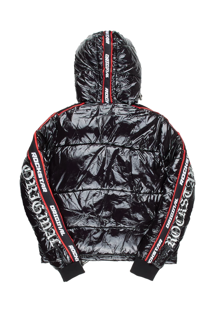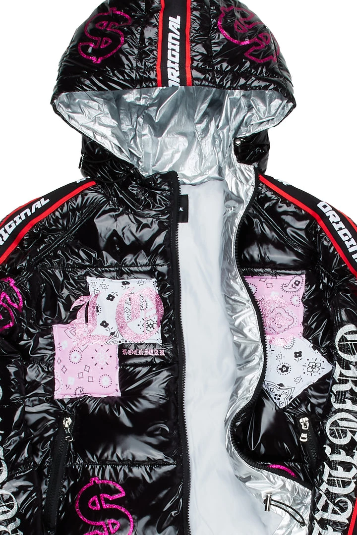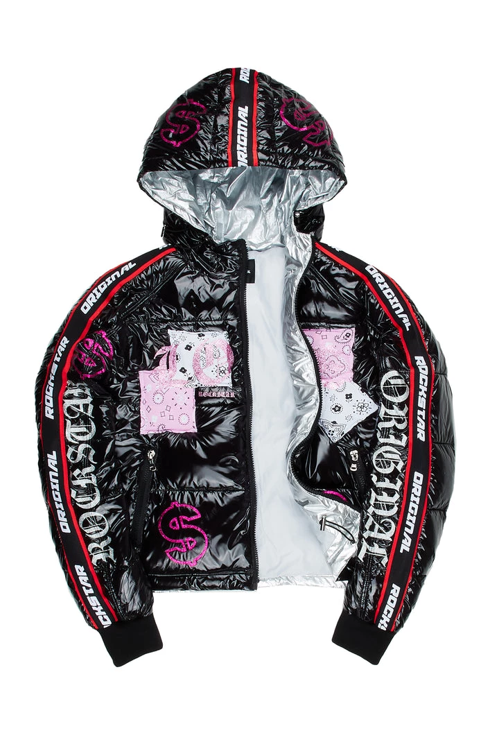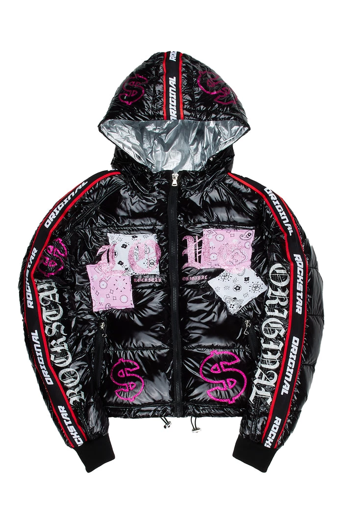 Rockstar Original Women’s crop puffer jacket in gleaming black. Featuring embroidered and rhinestone RSO logos on the sides of the sleeves with an embroidered varsity number and printed star graphics throughout — your layer game will level up with this staple piece. Accenting versatile material to keep you cool, comfortable, functional and fashionable. This new must-have bubble coat is styled with a drawstring fastening hood, high quality zipper pockets and a zipper closure.