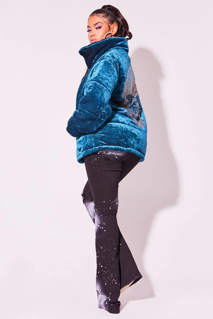 Rockstar Original Women’s crop puffer jacket in sweet teal. Featuring a posterior rhinestone graphic — your winterwear game will level up with this piece. Accenting versatile material to keep you cool, comfortable, functional and fashionable. This new must-have puff coat is styled with a drawstring fastening waistband, a high quality zipper closure and a gorgeous velvet finish. Turn up the heat this winter season!
