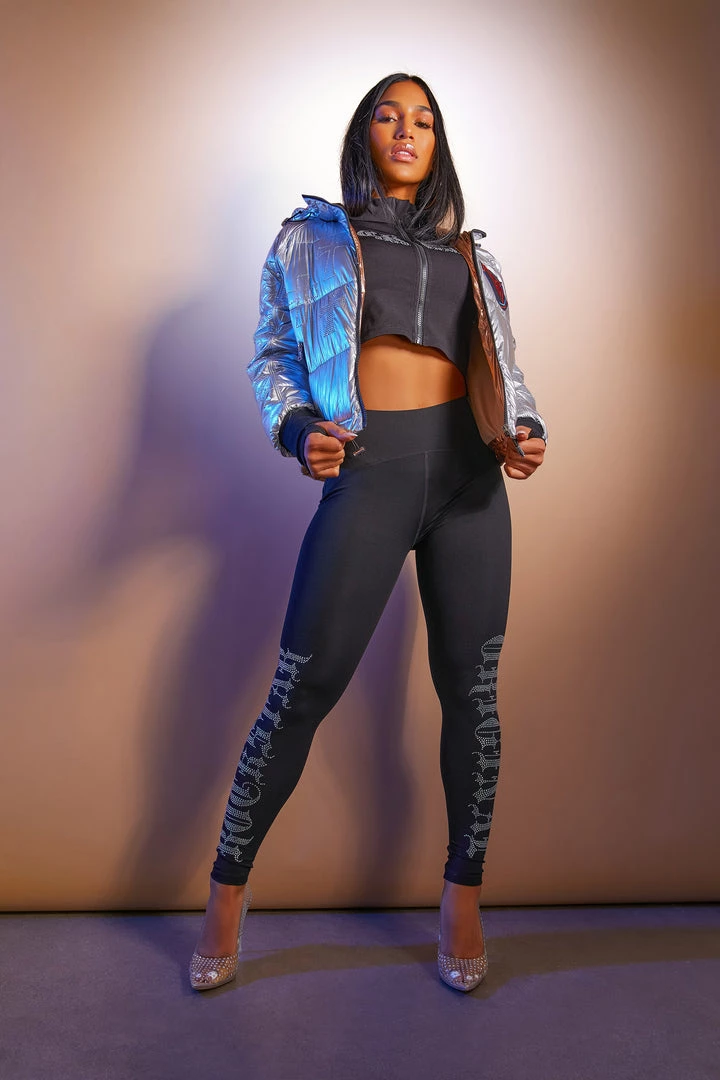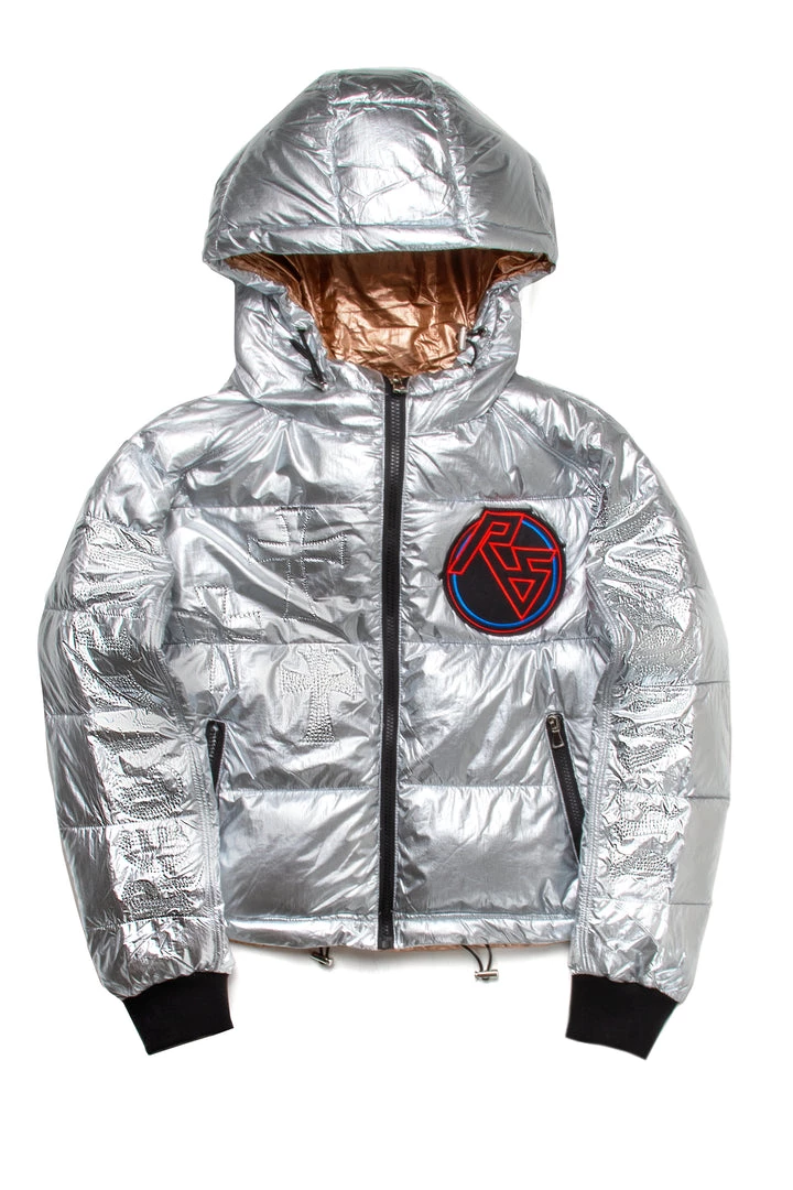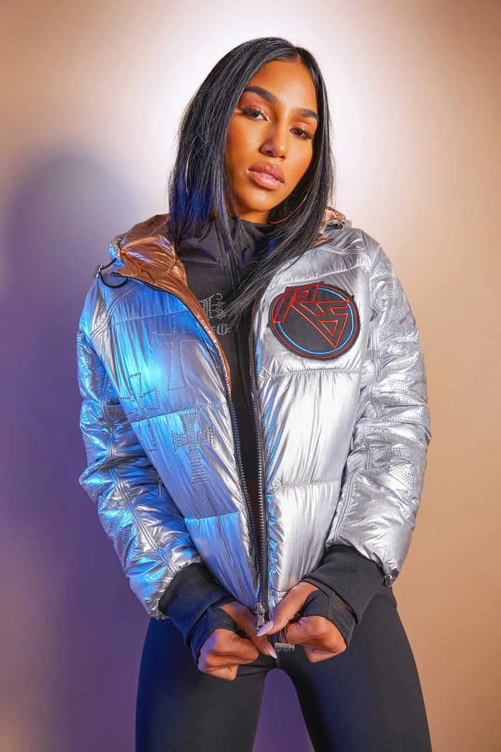 Rockstar Original Women’s crop puffer jacket in stunning silver. Featuring a front embroidered RSO logo and bold posterior RSO graphic with rhinestone detailing throughout. Accenting versatile material to keep you cool, comfortable, functional and fashionable. This new must-have bubble coat is styled with a drawstring fastening hood and hem, zipper pockets and a high quality zipper closure. Turn up the heat this winter season!