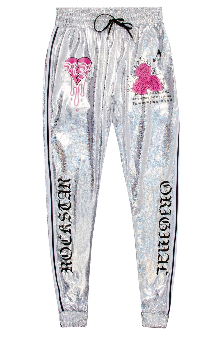 Rockstar Original Women’s jogger pant in show-stopping silver. Featuring printed RSO logos with graphics to match against a shimmering snake print design. This unique style is made with a drawstring waistband, embroidered side stripes and cuffed hems. Style with a solid black crop and boots for the hottest Rockstar babe fit!