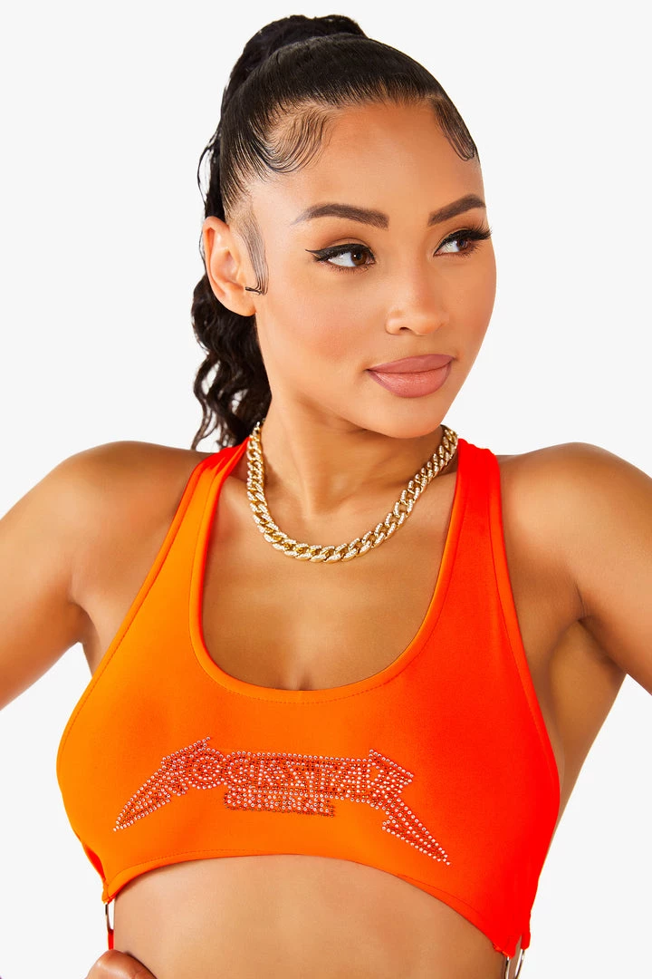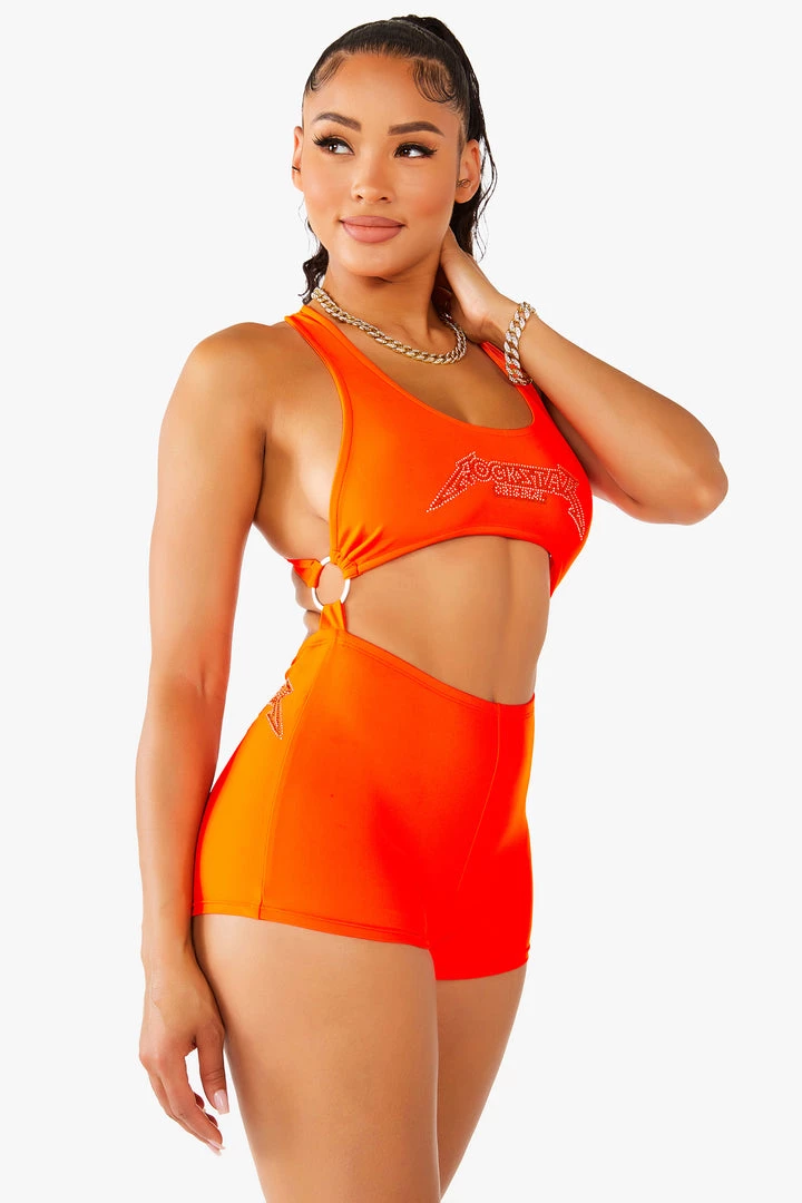 Rockstar Original women’s sexy romper with cutouts, o-rings at the sides, and jeweled RSO logos.