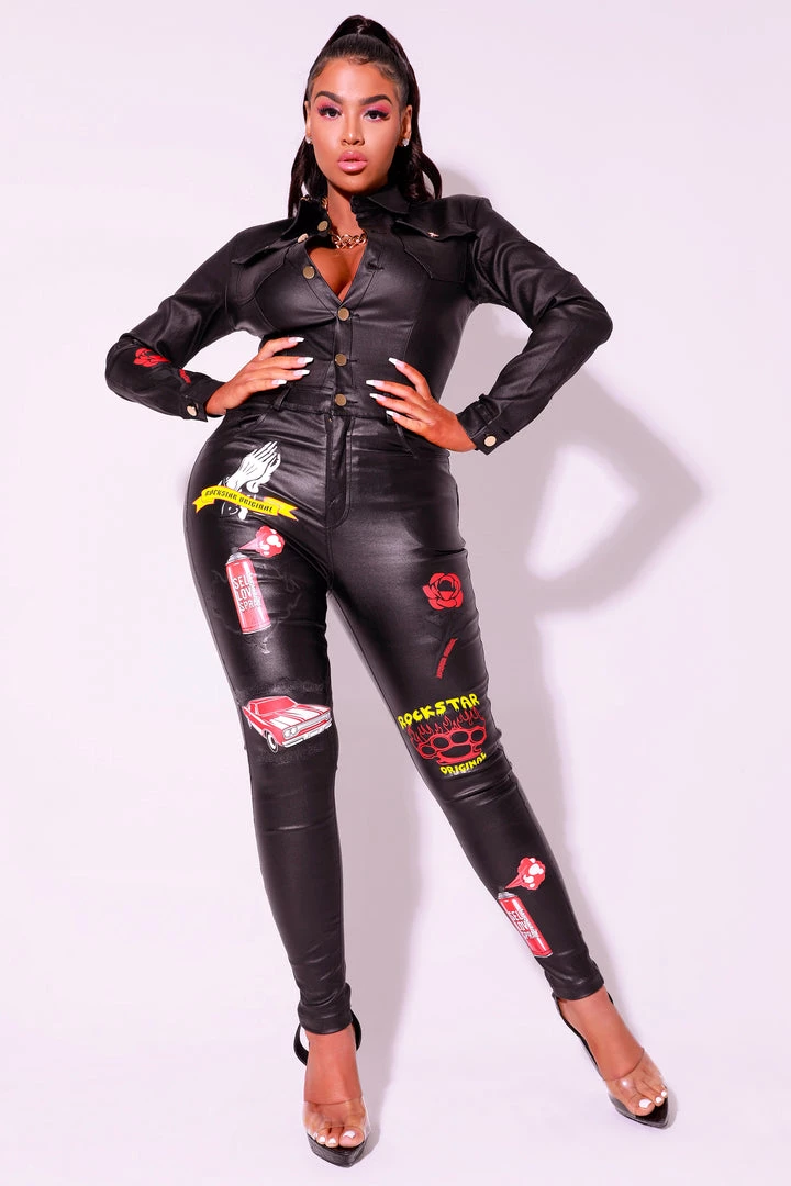 Rockstar Original Women’s faux leather jumpsuit in shimmering black. Featuring printed RSO logos and high quality button closures throughout in gorgeous gold. This boss babe fit accents a collared neckline and form-fitting silhouette that will hug every curve in all the right places. Less is definitely more with this all-in-one ensemble!