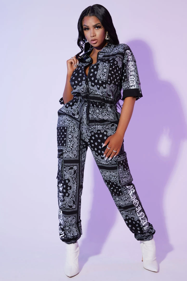 Rockstar Original Women’s denim jumpsuit. Featuring a graphic paisley print pattern throughout with cuffed hems, a collared neckline and a high quality front zipper closure. Less is definitely more with this all-in-one ensemble! Style with nude heels and your favorite hoop earrings for the hottest OOTD!