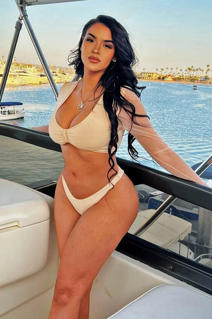Rockstar Original Women’s Festival Edition two-piece swimsuit in beige. Featuring a long sleeve top with mesh sleeves and a plunge neckline. Bottoms accent a high-waisted fit with cheeky bottoms for the hottest festival babe OOTD!