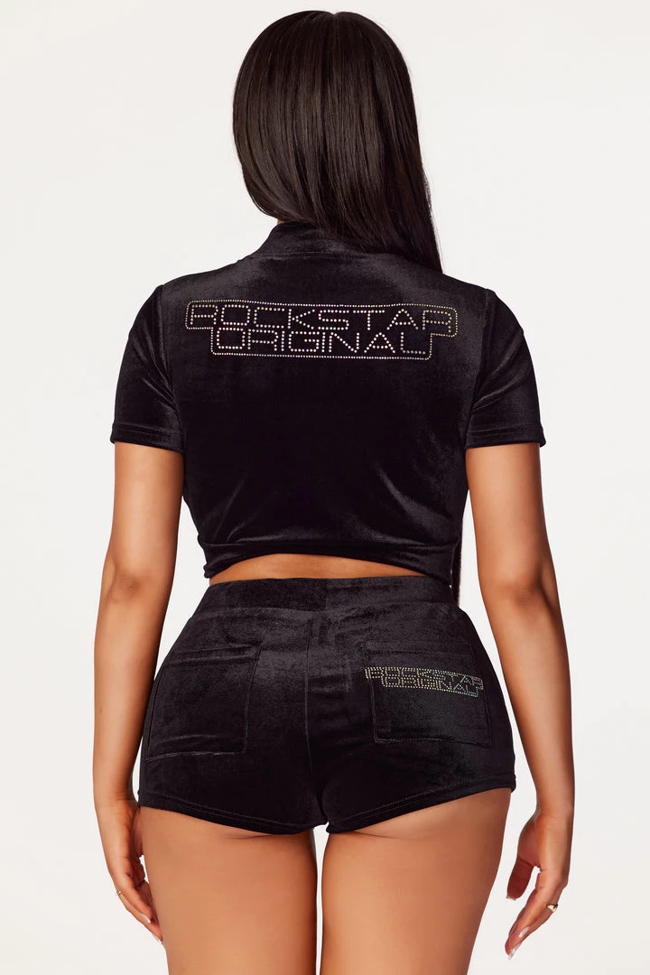 Rockstar Original Women’s two-piece short set in black. Featuring rhinestone RSO logos on the top and bottoms with a gorgeous velvet finish throughout. Jacket accents an embroidered Baby logo on the chest with a mini length, a high quality zipper closure, short sleeves and a baseball collar. Shorts accent a mini length with pockets and a drawstring waistband.