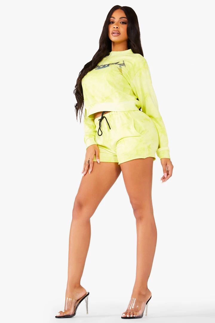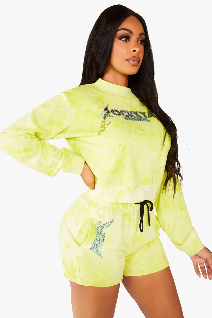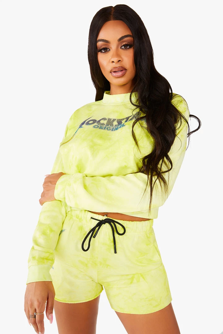 Rockstar Original Women’s pullover crew neck tie dye tracksuit set with cut off track short and bold crystal multi-color Rockstar Original logos.