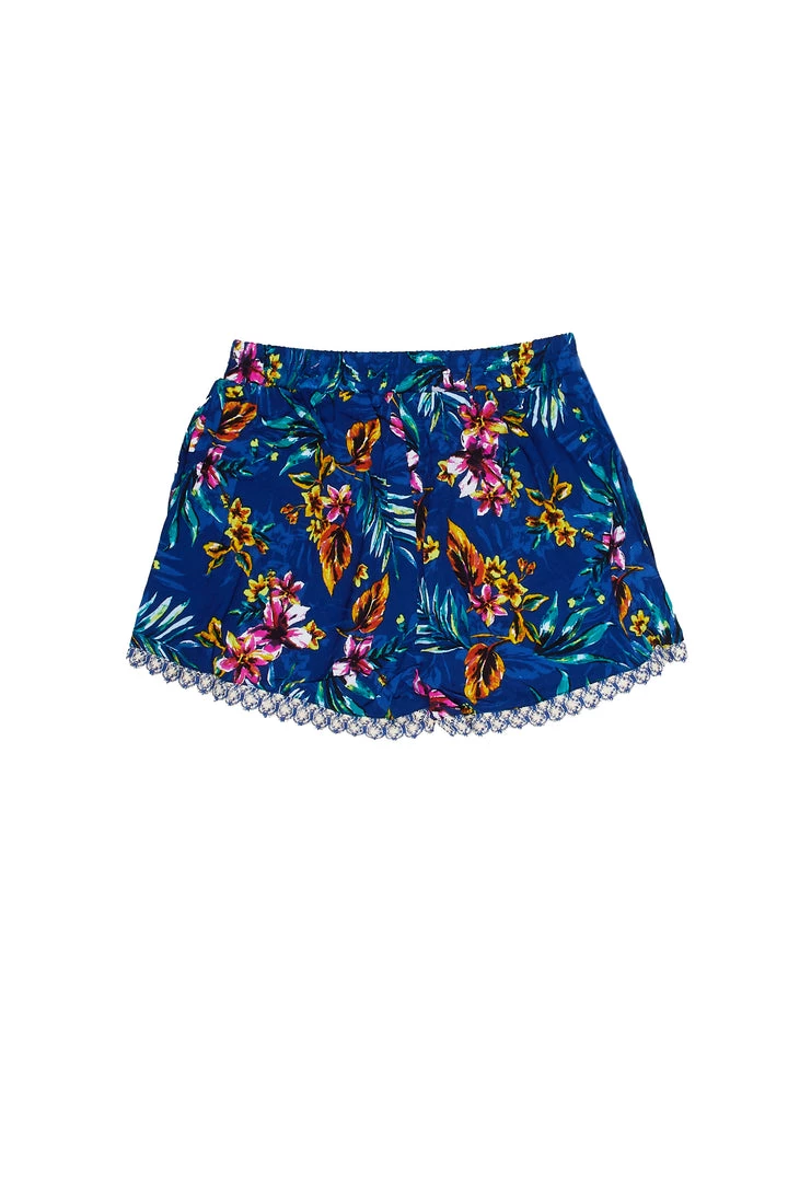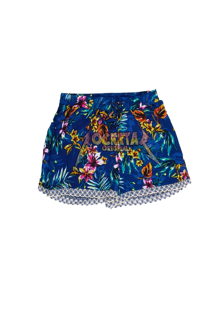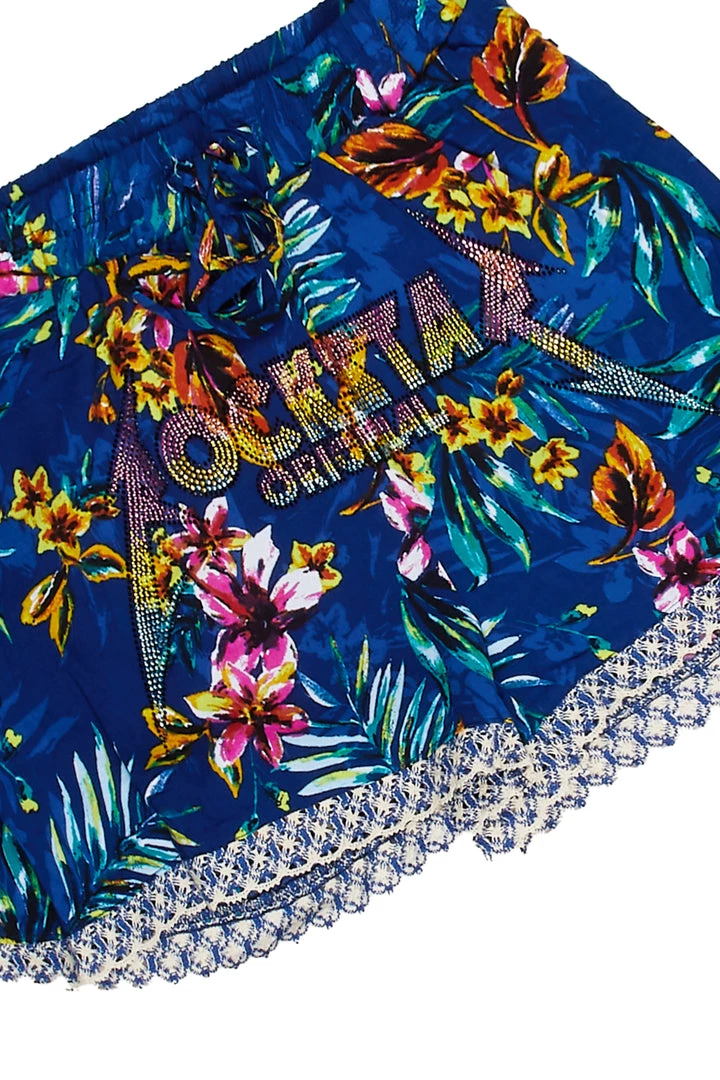 Rockstar Original Women’s shorts in royal blue. Featuring a rhinestone RSO logo, multi color floral designing and crochet trim hems. Style this staple piece over a bikini or with a bandeau top!