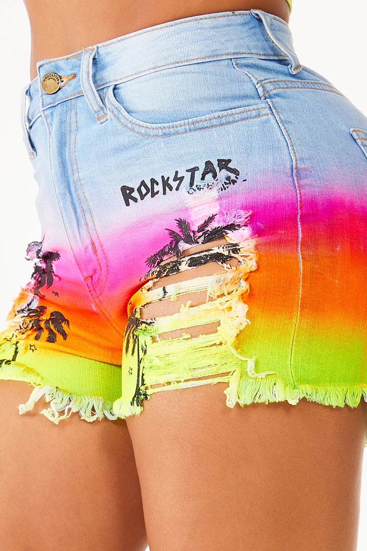 Rockstar Original Women’s hand painted shorts with bold RSO logos, custom palm tree painting, and destruction.