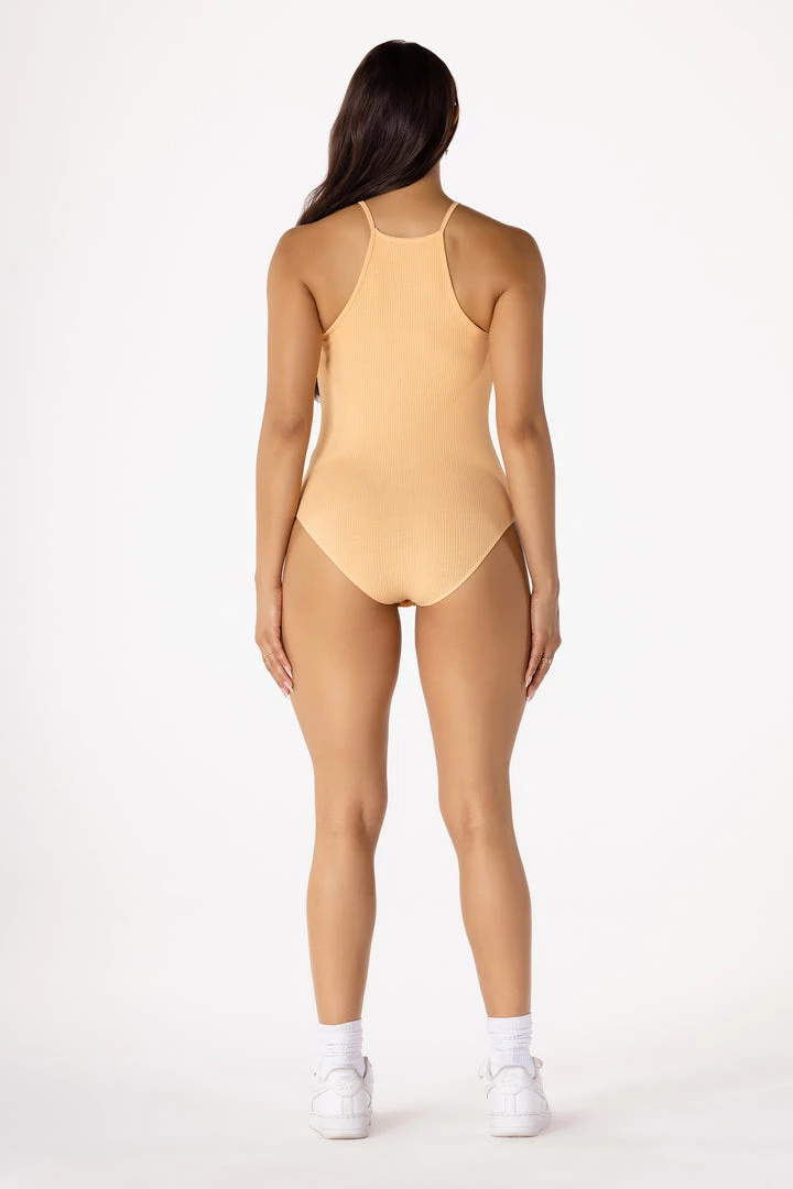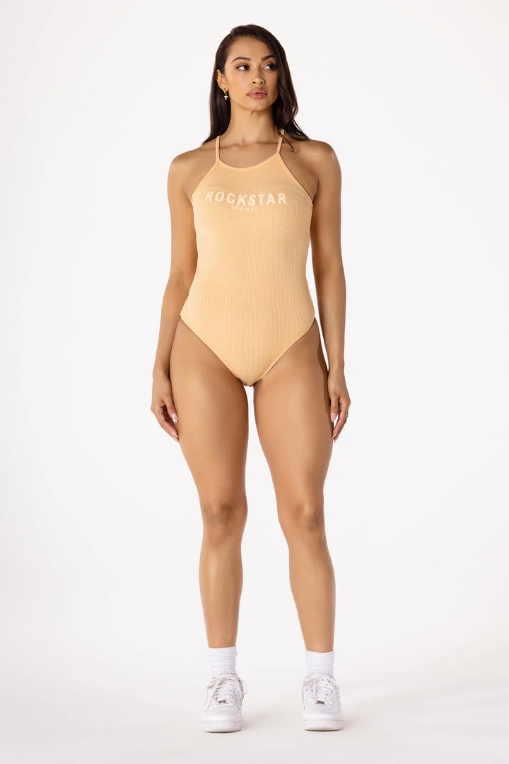 Rockstar Original Women’s essential cami bodysuit in peach. Featuring a printed RSO logo across the bust with a sleeveless, halter neckline design. Accenting ribbed stretch material and a button clasp closure.