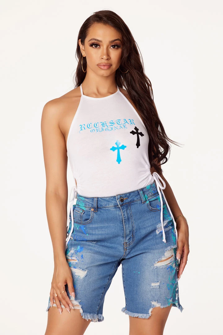 Rockstar Original Women’s one-piece cami bodysuit in white. Featuring a printed RSO logo across the bust with cross graphics to match. Accenting a halter neckline, ribbed stretch material and a button clasp closure with an O-ring side tie. Style with your favorite denim and heels for the ultimate Rockstar babe OOTD.