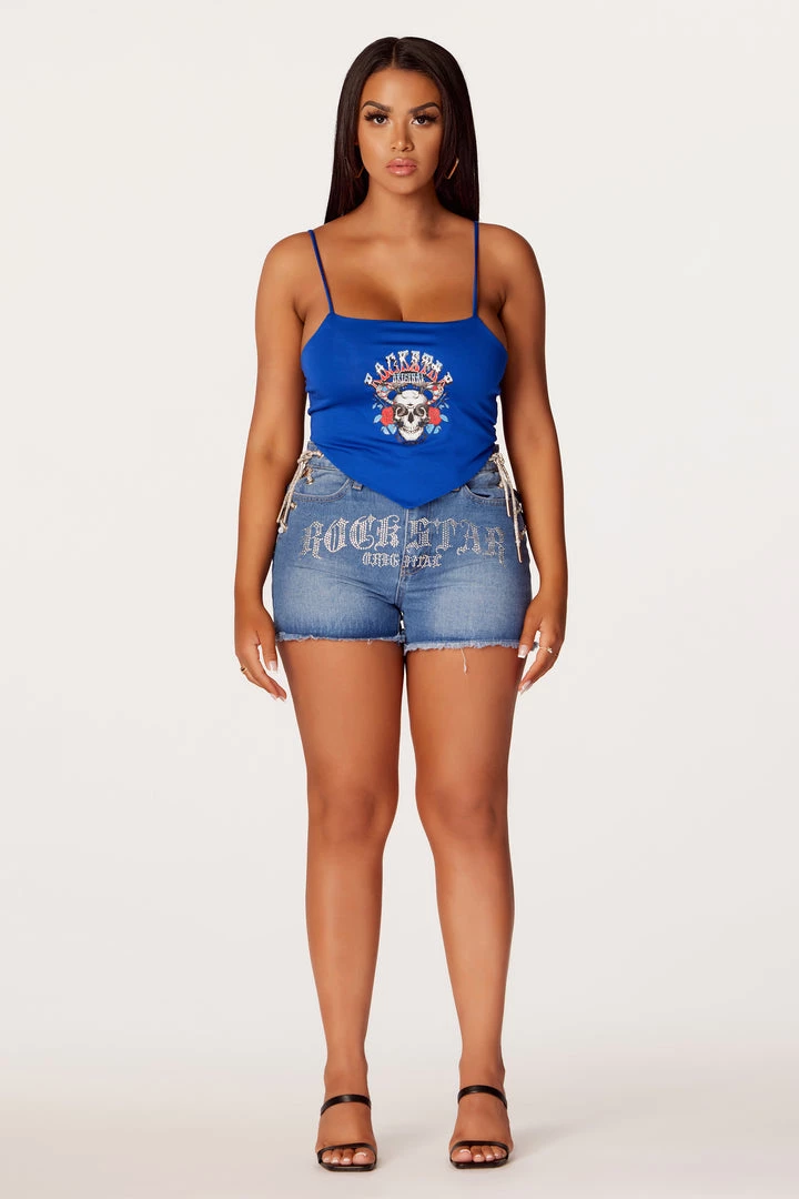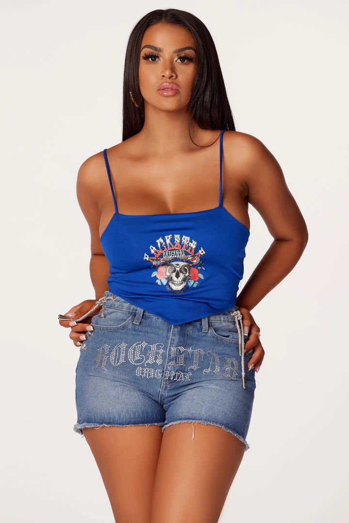 Rockstar Original Women’s tank top in royal blue. Featuring a printed RSO logo with a custom graphic to match. Accenting a square neckline, skinny straps and a cropped length with a triangle hem.
