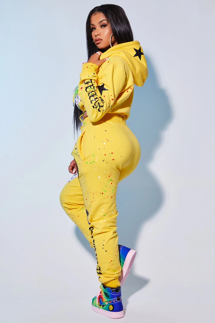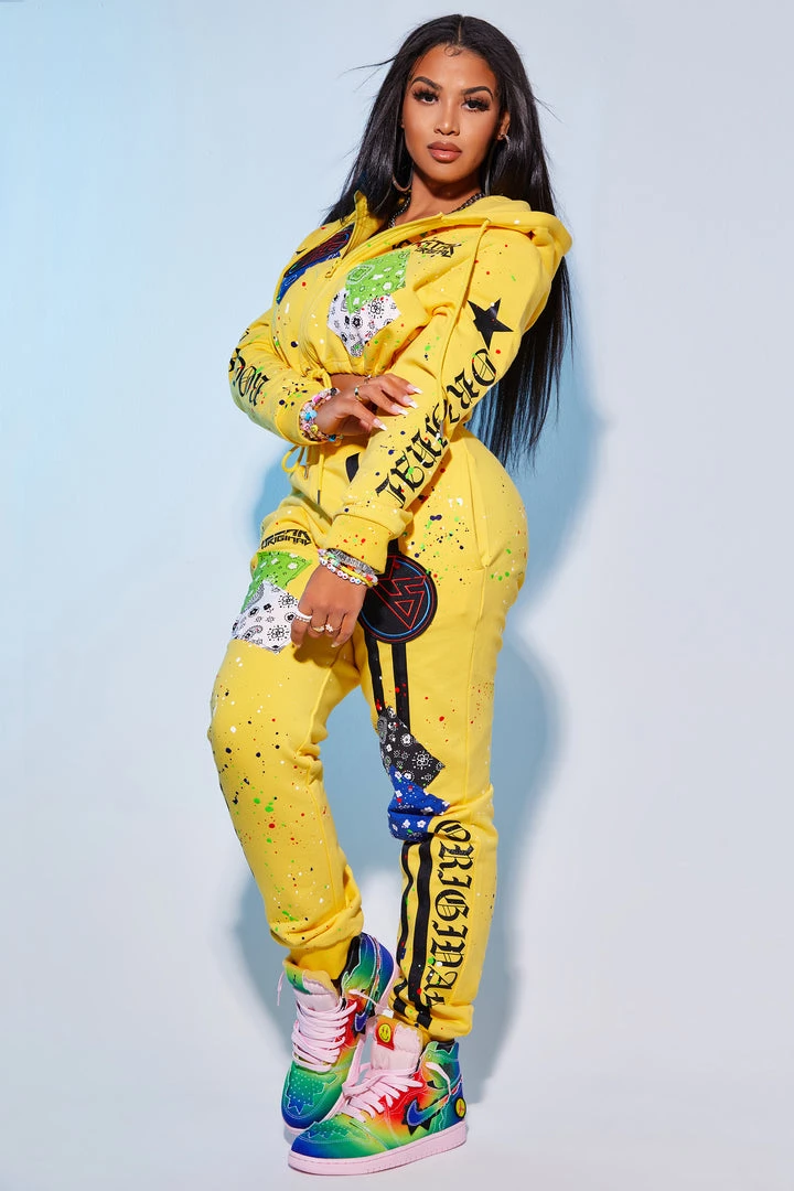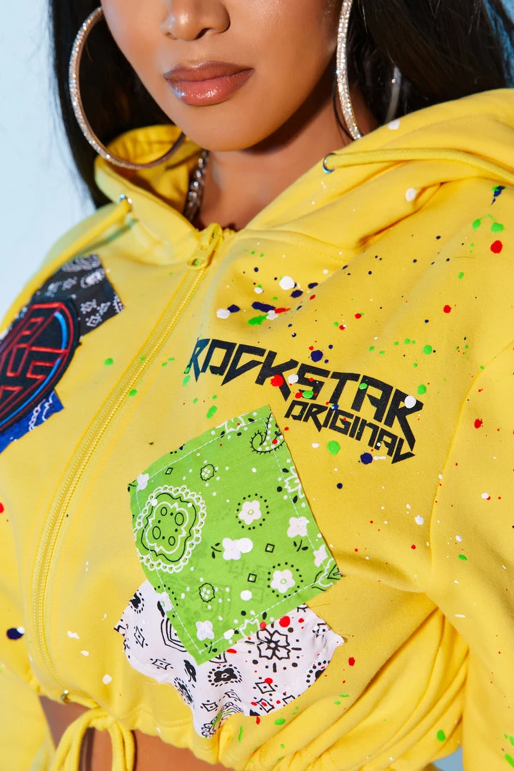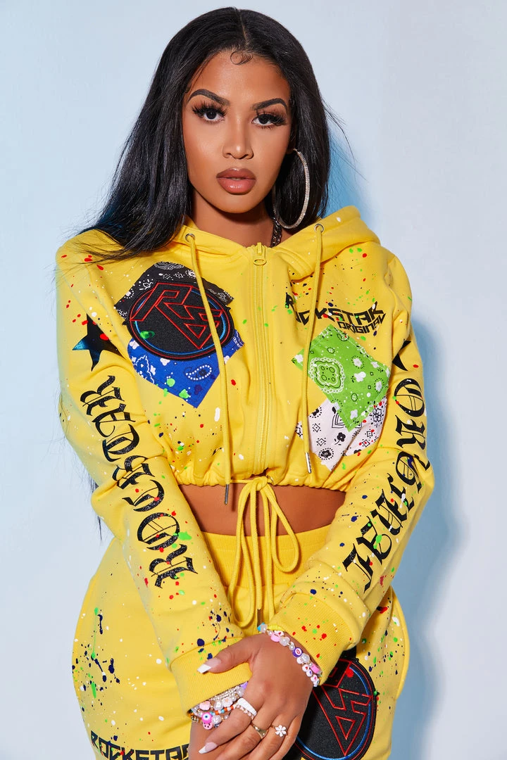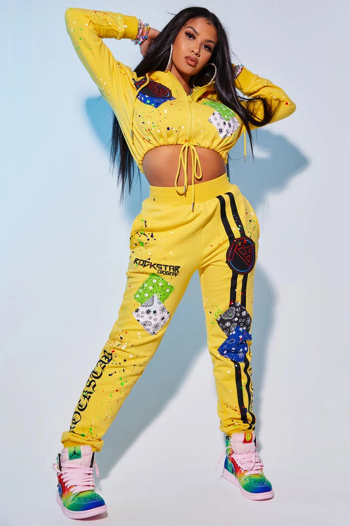 Rockstar Original Women’s two-piece tracksuit set in fresh yellow. Featuring a classic printed RSO logo with matching enlarged logos in Old English font with a racer stripe design on the pant. Stay fitted and fashion-forward with this set that accents a drawstring hood and hem and high quality zipper closure on the top, and a fitted waistband and pockets on the bottoms for comfort and convenience.