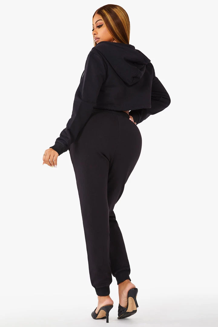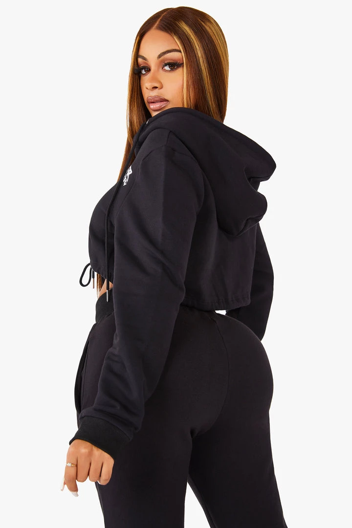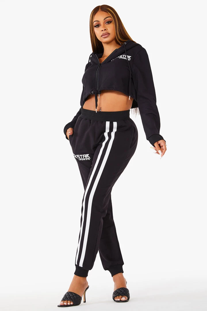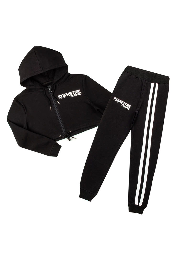 Rubi Rose x Rockstar Original Women’s two-piece crop top tracksuit set in chicest black. Featuring printed RSO logos on the top and bottoms with a stripe designing on the pant. Stay fitted and fashion-forward with this set that accents a drawstring hood and hem, high quality zipper closure, fitted waistband and pockets for comfort and convenience.