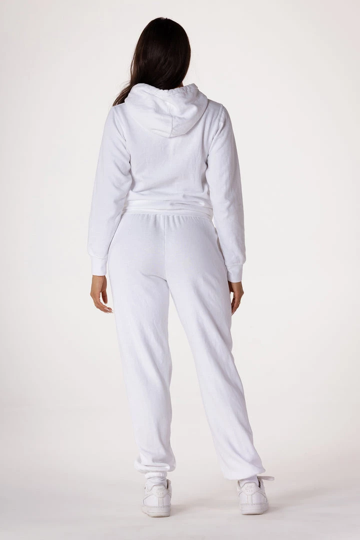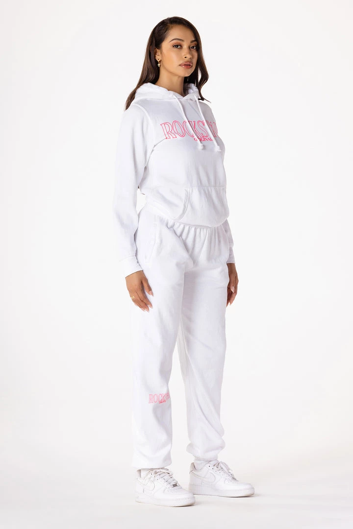 Rockstar Original Women’s two-piece essential sweat pant set in white. Featuring a clean RSO logo on the top and bottom. Top accents a drawstring hood and ribbed cuffs and hemline while bottoms accent a drawstring waistband, side pockets and ribbed cuffs. Designed with luxurious cotton for a super soft internal finish.
